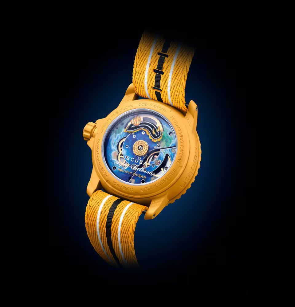Часы Swatch Swatch Blancpain Fifty Fathoms Scuba SO35P100CS - часы отдают дань уважения модели Fifty Fathoms от Blancpain, первым настоящим часам для дайвинга. Оранжевый корпус и заводная головка часов изготовлены из материала Bioceramic. Слово "Swatch" выгравировано на внешней левой стороне корпуса. Металлический циферблат напечатан в несколько слоев цвета для создания эффекта градиента. Часовые индексы, часовая и минутная стрелки, а также шкала на безеле обогащены люминесцентным покрытиемЛюминесцентное покрытиеПозволяет считывать показания времени в темноте. Производители наносят на стрелки, часовые индексы, безель или поверхность циферблата светонакопительный состав, дающий холодное свечение. Grade A Super-LumiNova® для превосходной читаемости в темноте. Часы оснащены черным однонаправленным вращающимся безелемБезельВнешний ободок, закрепляющий стекло. В спортивных часах так называется поворотное кольцо с делениями на циферблате, выполняет роль таймера – замеряет отрезки времени на шкале. Неподвижный безель – элемент декора. Однонаправленно вращающийся безель на дайверских часах позволяет фиксировать моменты погружения и выныривания на поверхность. из материала Bioceramic и стеклом из биоматериалов. Механизм SISTEM51 виден благодаря прозрачному сапфировому стеклу и украшен цифровым изображением Тихого океана. На задней крышке часов можно найти пять вдохновляющих надписей: СТРАСТЬ К ДАЙВИНГУ – ЛИЦЕНЗИЯ НА ИССЛЕДОВАНИЕ – ДЫХАНИЕ ОКЕАНА – ЗАЩИЩАЙ ТО, ЧТО ЛЮБИШЬ и ПОГРУЗИСЬ. Ремешок NATO изготовлен из переработанных рыболовных сетей, извлеченных из моря. Пряжка и петли сделаны из материала Bioceramic.
