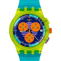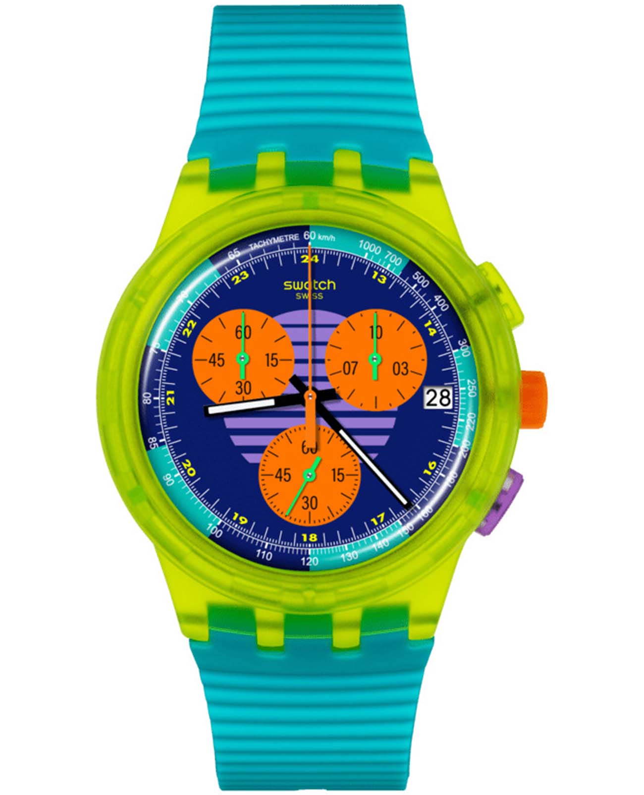 Часы Swatch SUSJ404 — это стильный и современный аксессуар для тех, кто ценит лёгкость и комфорт. Часы идеально подойдут как для мужчин, так и для женщин. Этот хронографХронографФункция позволяет измерять отрезки времени с особой точностью: часы, минуты, секунды. Верным признаком хронографа является наличие на циферблате 3 дополнительных окошек-счётчиков. неоновой расцветки создан по мотивам модели Swatch CHRONO 90-х годов: NEO WAVE (SCJ100). На разноцветном циферблате имеются шкала тахиметраТахиметрРазмеченная шкала, располагается на ободке или безеле часов. Тахиметр позволяет рассчитать скорость на определённом участке пути, расстояние измеряется в километрах или милях. и окошко календаря на уровне 3-часовой отметки. Часовая и минутная стрелки черного цвета, а также оранжевая секундная светятся в темноте благодаря люминесцентному покрытиюЛюминесцентное покрытиеПозволяет считывать показания времени в темноте. Производители наносят на стрелки, часовые индексы, безель или поверхность циферблата светонакопительный состав, дающий холодное свечение.. Часы заключены в прозрачный корпус матово-желтой расцветки с таким же безелемБезельВнешний ободок, закрепляющий стекло. В спортивных часах так называется поворотное кольцо с делениями на циферблате, выполняет роль таймера – замеряет отрезки времени на шкале. Неподвижный безель – элемент декора. Однонаправленно вращающийся безель на дайверских часах позволяет фиксировать моменты погружения и выныривания на поверхность.. На фактурном бирюзовом ремешке контрастно выделяются полупрозрачные тренчики желтого и оранжевого цвета и синяя пряжка. Водозащита 30 метров делает часы практичными для повседневного использования. Эти часы подойдут для повседневного ношения и станут ярким акцентом в вашем наряде.