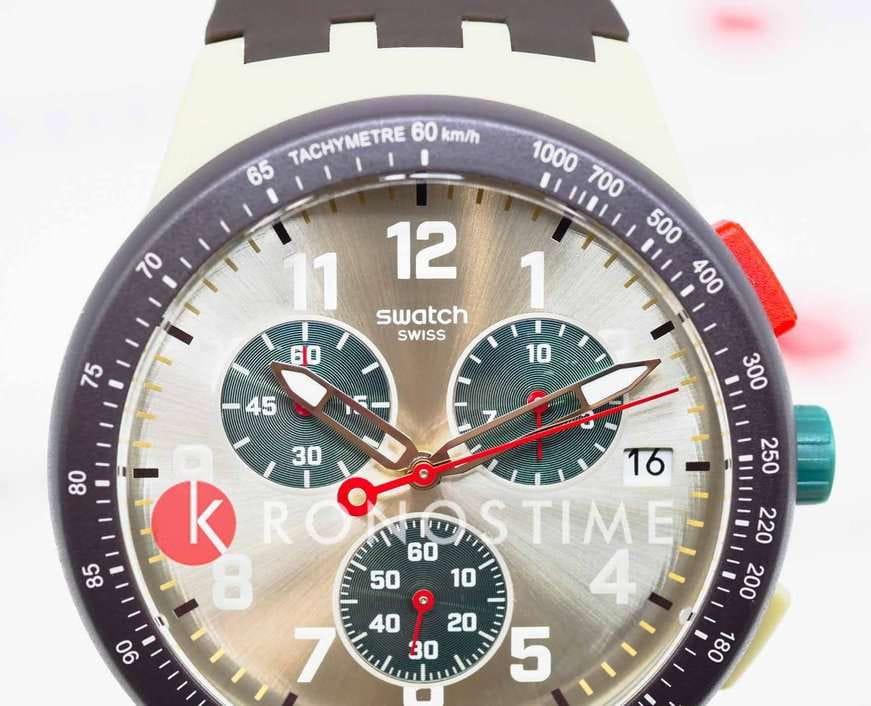 Часы Swatch SUST402 — это стильный и современный аксессуар для тех, кто ценит лёгкость и комфорт. Часы идеально подойдут как для мужчин, так и для женщин. Этот хронографХронографФункция позволяет измерять отрезки времени с особой точностью: часы, минуты, секунды. Верным признаком хронографа является наличие на циферблате 3 дополнительных окошек-счётчиков. привлекает внимание серебристым циферблатом c радиальной полировкой и тёмно-зелёными дополнительными циферблатами, светящимися в темноте благодаря люминесцентному покрытиюЛюминесцентное покрытиеПозволяет считывать показания времени в темноте. Производители наносят на стрелки, часовые индексы, безель или поверхность циферблата светонакопительный состав, дающий холодное свечение. часовой и минутной, красными секундной и вспомогательными стрелками, а также окошком указателем даты в положении между «4» и «3» часами. Матовый бежевый корпус располагает тёмно-коричневым безелемБезельВнешний ободок, закрепляющий стекло. В спортивных часах так называется поворотное кольцо с делениями на циферблате, выполняет роль таймера – замеряет отрезки времени на шкале. Неподвижный безель – элемент декора. Однонаправленно вращающийся безель на дайверских часах позволяет фиксировать моменты погружения и выныривания на поверхность. с белой тахиметрической шкалой и разноцветной заводной головкой и кнопками. Его дополняет матовый тёмно-коричневый ремешок с тренчиком в тон и матовая бежевая пряжка. Водозащита 30 метров делает часы практичными для повседневного использования. Эти часы подойдут для повседневного ношения и станут ярким акцентом в вашем наряде.