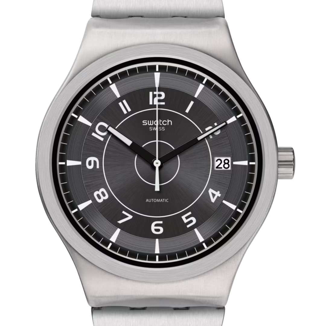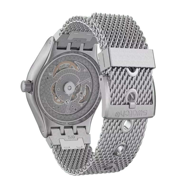 Часы Swatch YIS418MA — это стильный и современный аксессуар для тех, кто ценит надежность и комфорт.  Эти элегантные автоматические часы имеют черный циферблат с радиальной полировкой, черными стрелками с люминесцентным покрытиемЛюминесцентное покрытиеПозволяет считывать показания времени в темноте. Производители наносят на стрелки, часовые индексы, безель или поверхность циферблата светонакопительный состав, дающий холодное свечение. и белой шкалой. В районе отметки 3 часа размещено белое окошко календаря с черным принтом. Матовый корпус выполнен из нержавеющей стали, а через заднюю крышку с цифровым принтом просматривается механизм SISTEM51. Общий вид модели довершает браслет "миланского плетения" из нержавеющей стали с матовой и полированной отделкой. Застежка классическая. Водозащита 30 метров позволит защитить корпус от случайных брызг или капель дождя, что делает часы практичными для повседневного использования. Эти часы подойдут для повседневного ношения и станут ярким акцентом в вашем образе.