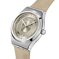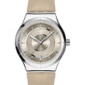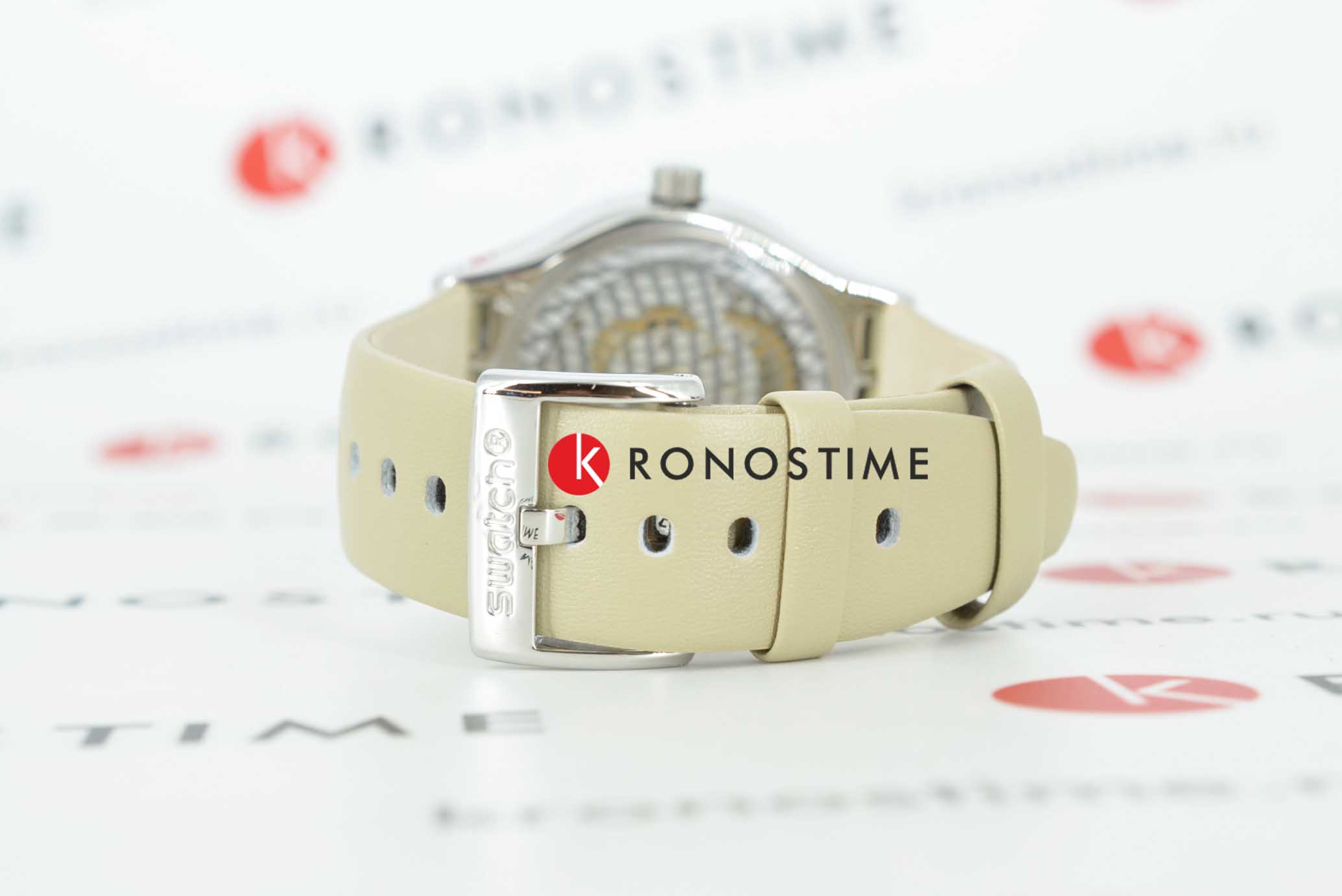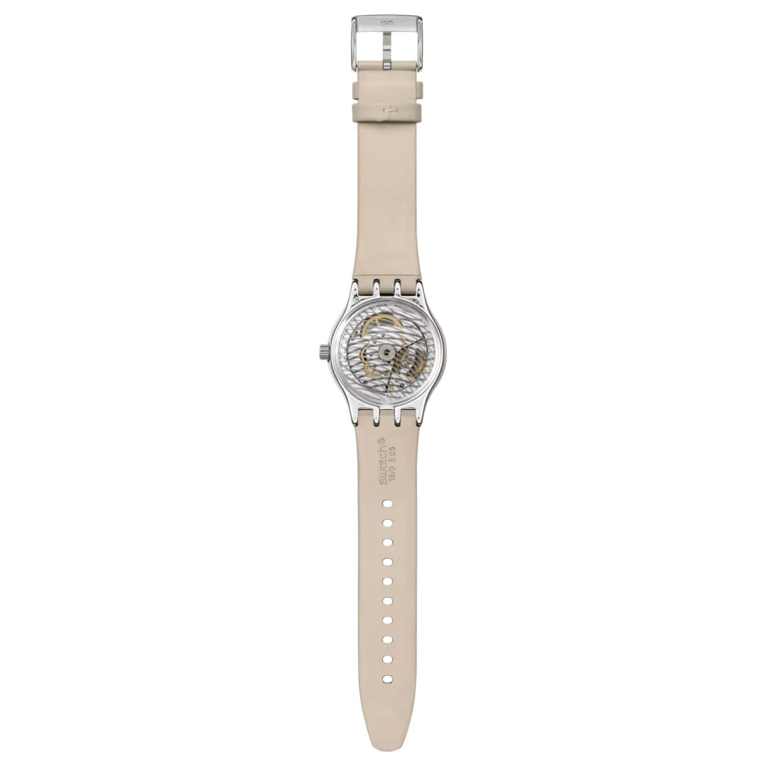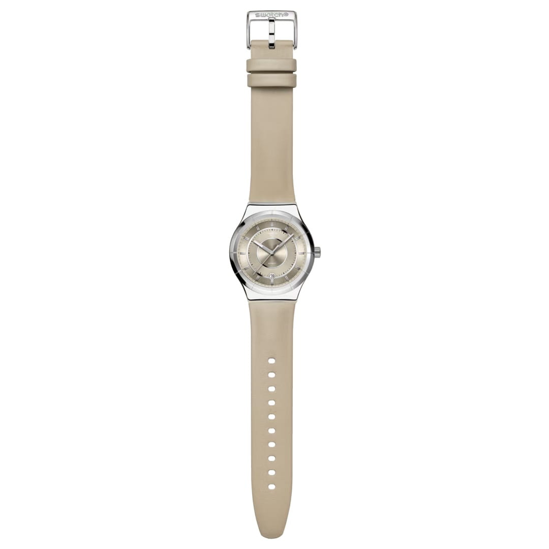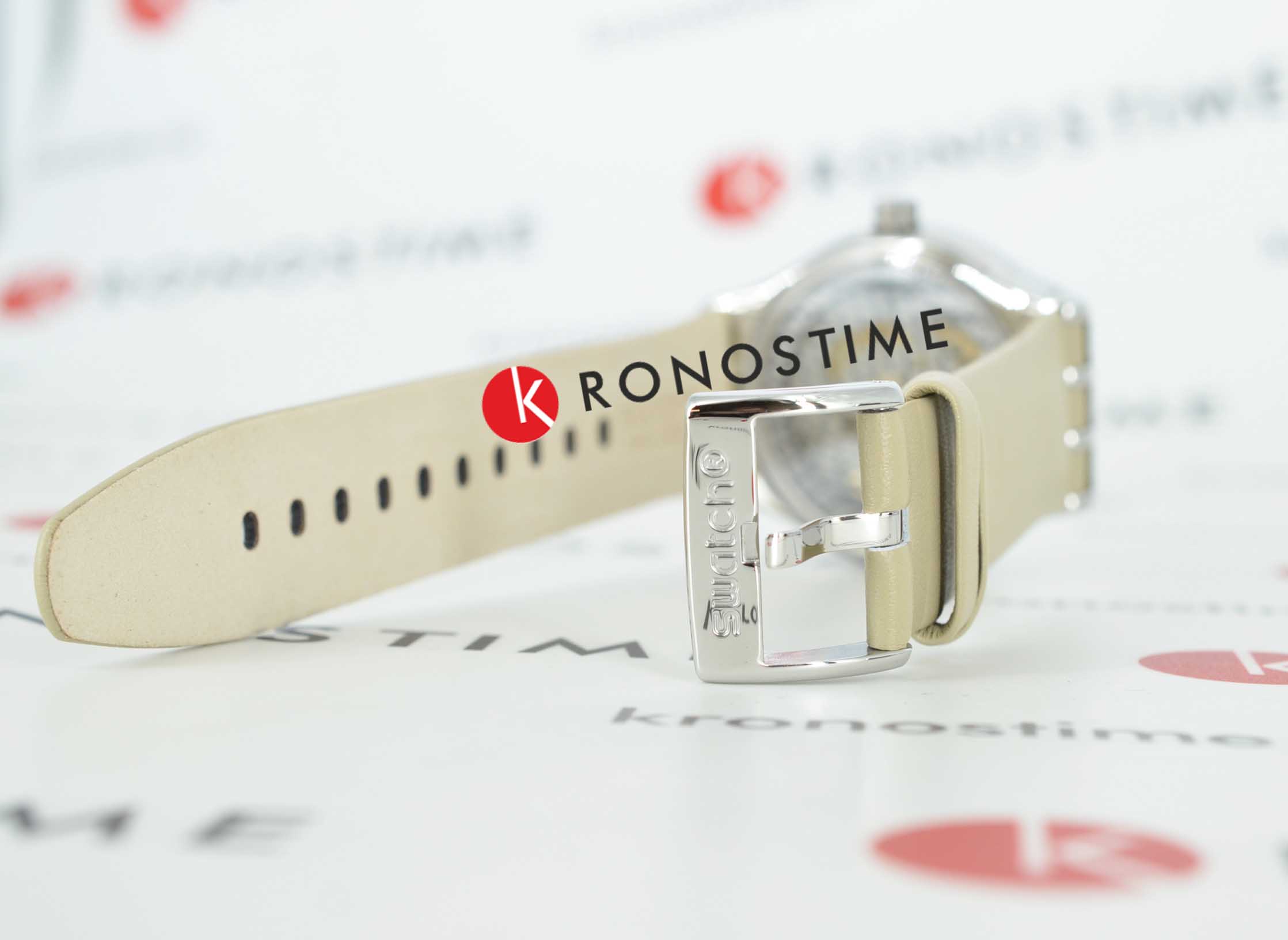Часы Swatch YIS434  — это стильный и современный аксессуар для тех, кто ценит надежность и комфорт. Эти механические часы имеют полированный бежевый циферблат и индексы. Стрелки с люминесцентным покрытиемЛюминесцентное покрытиеПозволяет считывать показания времени в темноте. Производители наносят на стрелки, часовые индексы, безель или поверхность циферблата светонакопительный состав, дающий холодное свечение., светятся в темноте. Окошко календаря расположено в положении 6 часов. Блестящий корпус из нержавеющей стали, а через заднюю крышку с цифровым принтом просматривается механизм SISTEM51. Модель оснащена автоматическим механизмом Sistem51, который состоит всего из 51 детали и имеет запас хода 90 часов.  Дополняет модель бежевый ремешок из кожи с классической застежкой. Водозащита 30 метров позволяет защитить корпус от случайных брызг или капель дождя, что делает часы практичными для повседневного использования. Эти часы станут ярким акцентом в вашем образе.