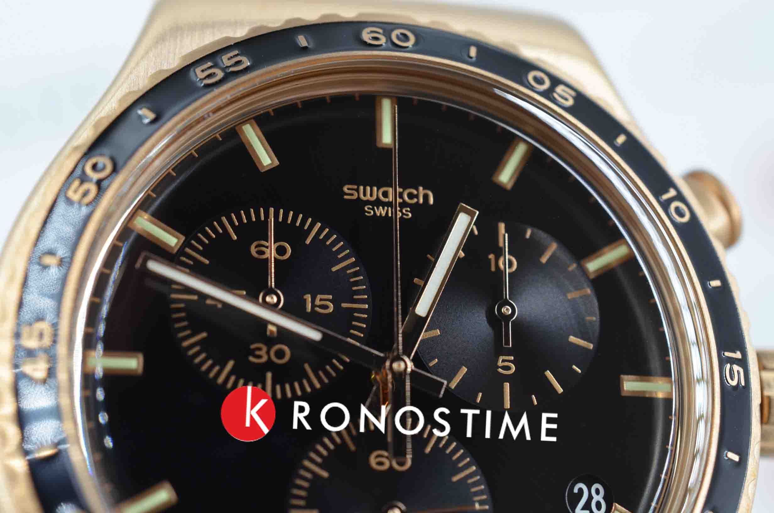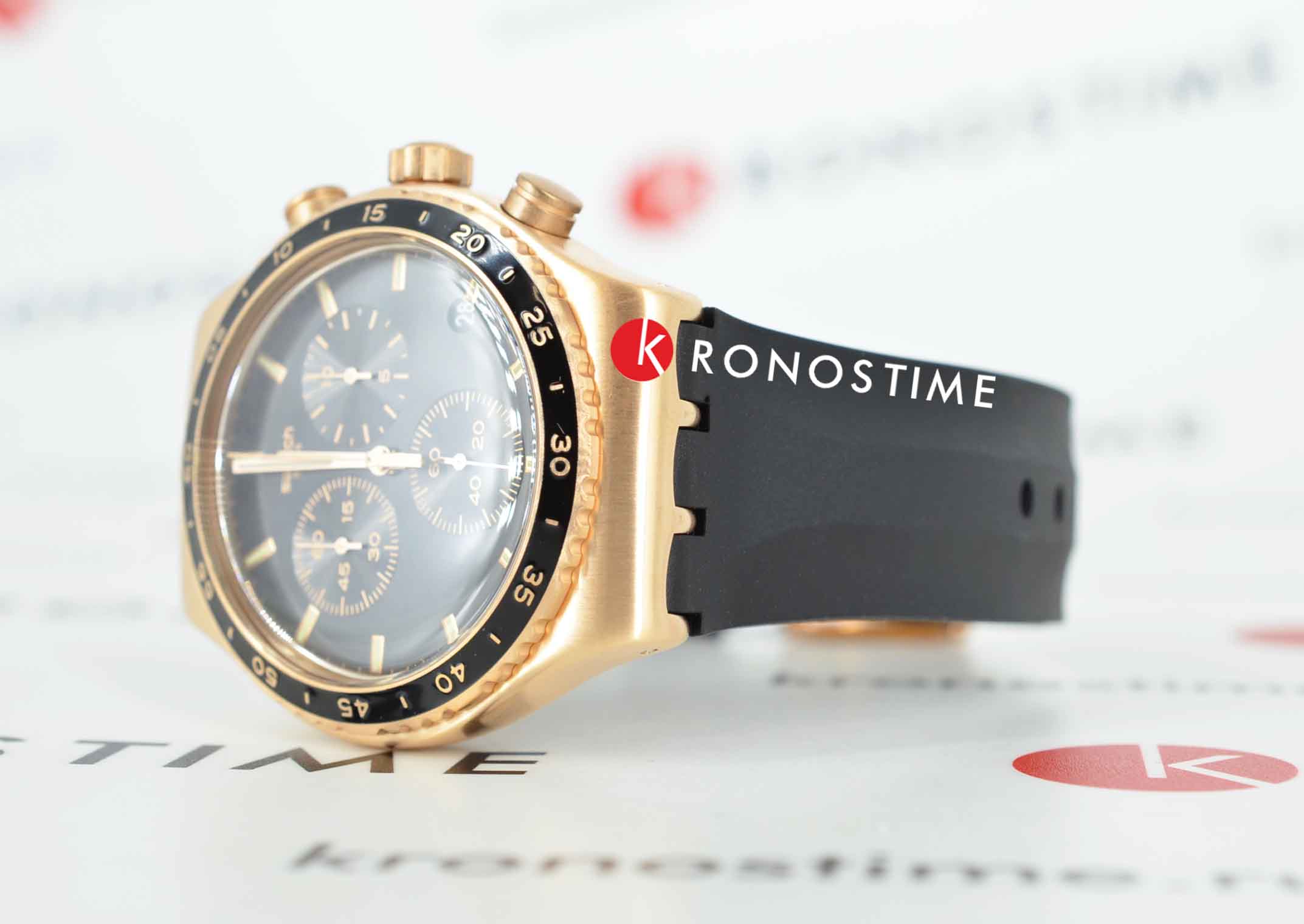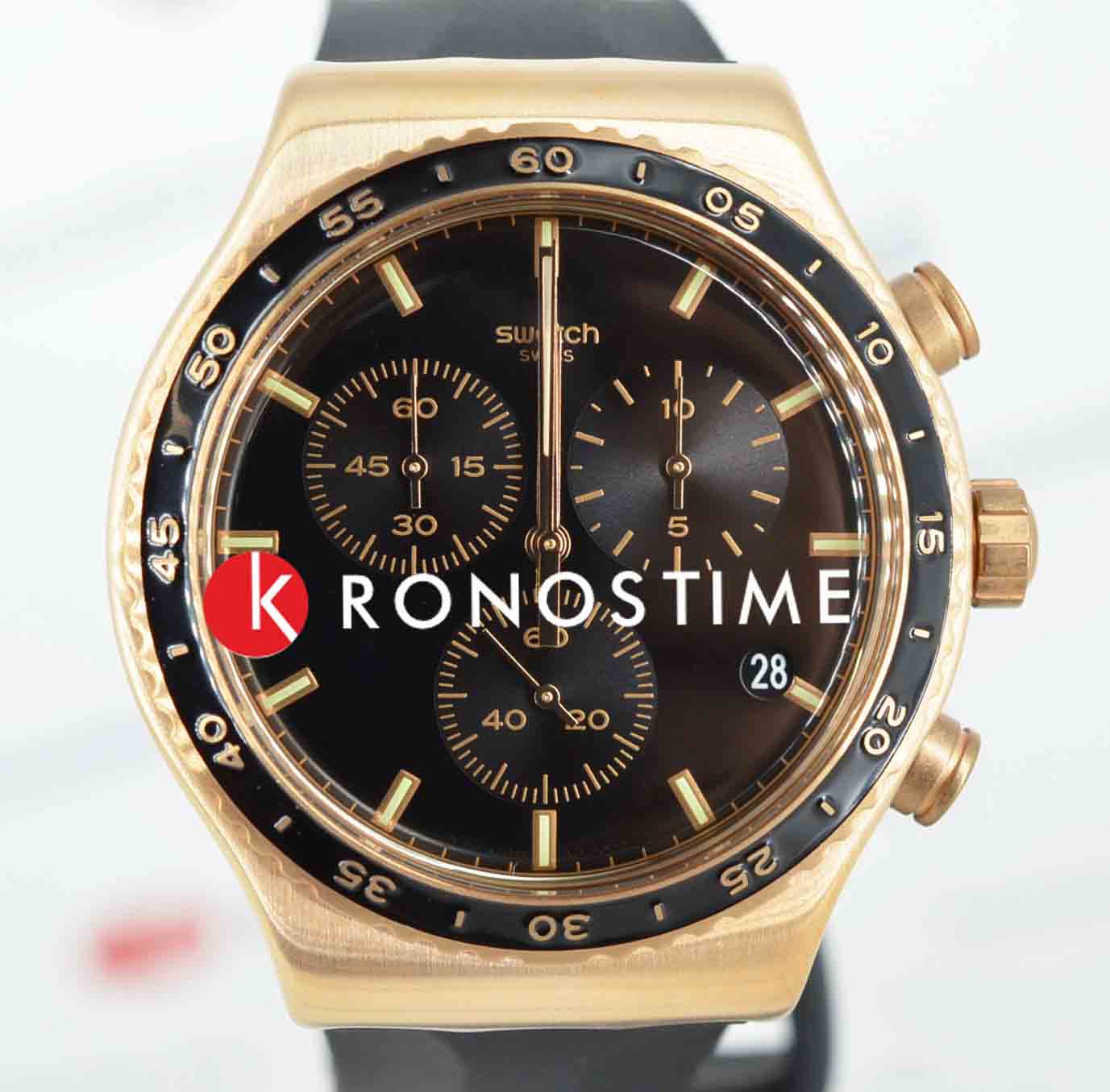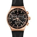 Часы Swatch YVG410 — это стильный и современный аксессуар для тех, кто ценит лёгкость и комфорт. Эти невероятные часы -хронографХронографФункция позволяет измерять отрезки времени с особой точностью: часы, минуты, секунды. Верным признаком хронографа является наличие на циферблате 3 дополнительных окошек-счётчиков. из нержавеющей стали цвета розового золота дополнены черным каучуковым ремешком с металлической пряжкой, сочетающейся с матовым металлическим корпусом и безелемБезельВнешний ободок, закрепляющий стекло. В спортивных часах так называется поворотное кольцо с делениями на циферблате, выполняет роль таймера – замеряет отрезки времени на шкале. Неподвижный безель – элемент декора. Однонаправленно вращающийся безель на дайверских часах позволяет фиксировать моменты погружения и выныривания на поверхность. с PVDPVDУльтратонкое покрытие наносится в технике вакуумного напыления, сочетает в себе нитрид титана особой прочности со слоем золота или оксида хрома. Несёт в себе декоративную или защитную функцию. покрытием. На черном циферблате отчетливо выделяются индексы цвета розового золота и такие же стрелки с эффектом свечения в темноте благодаря люминесцентному покрытиюЛюминесцентное покрытиеПозволяет считывать показания времени в темноте. Производители наносят на стрелки, часовые индексы, безель или поверхность циферблата светонакопительный состав, дающий холодное свечение.. Водозащита 30 метров делает часы практичными для повседневного использования. Эти часы подойдут для повседневного ношения и станут ярким акцентом в вашем наряде.