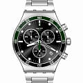 Часы Swatch YVS506G — это стильный и современный аксессуар для тех, кто ценит лёгкость и комфорт. Эта стильная модель часов из нержавеющей стали дополнена полированным металлическим браслетом из нержавеющей стали со съемными звеньями и застёжкой «бабочка»Застёжка "бабочка"Такой вид застёжки дополняется предохранителями, помогающими избежать случайного раскрытия браслета. Обладают изящным исполнением. . Черный циферблат с радиальной полировкой оснащен хронографомХронографФункция позволяет измерять отрезки времени с особой точностью: часы, минуты, секунды. Верным признаком хронографа является наличие на циферблате 3 дополнительных окошек-счётчиков. и светящимися в темноте индексами и стрелками из-за люминесцентного покрытияЛюминесцентное покрытиеПозволяет считывать показания времени в темноте. Производители наносят на стрелки, часовые индексы, безель или поверхность циферблата светонакопительный состав, дающий холодное свечение. заключен в матовый корпус из нержавеющей стали. Завершают образ индикатор даты в положении «4:30» на циферблате, а также серебристые цифры и индексы на зеленом безелеБезельВнешний ободок, закрепляющий стекло. В спортивных часах так называется поворотное кольцо с делениями на циферблате, выполняет роль таймера – замеряет отрезки времени на шкале. Неподвижный безель – элемент декора. Однонаправленно вращающийся безель на дайверских часах позволяет фиксировать моменты погружения и выныривания на поверхность. из нержавеющей стали с PVDPVDУльтратонкое покрытие наносится в технике вакуумного напыления, сочетает в себе нитрид титана особой прочности со слоем золота или оксида хрома. Несёт в себе декоративную или защитную функцию. покрытием. Водозащита 30 метров делает часы практичными для повседневного использования. Эти часы подойдут для повседневного ношения и станут ярким акцентом в вашем наряде.