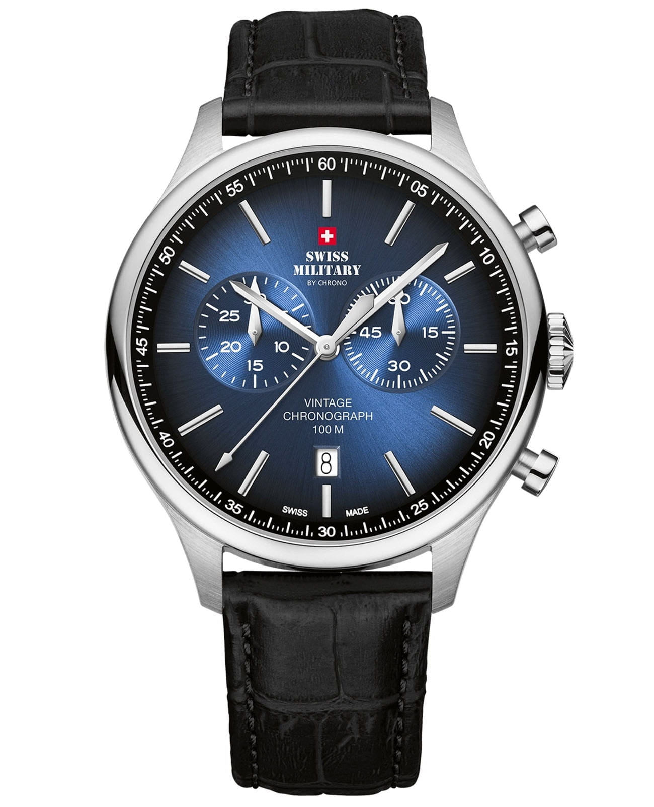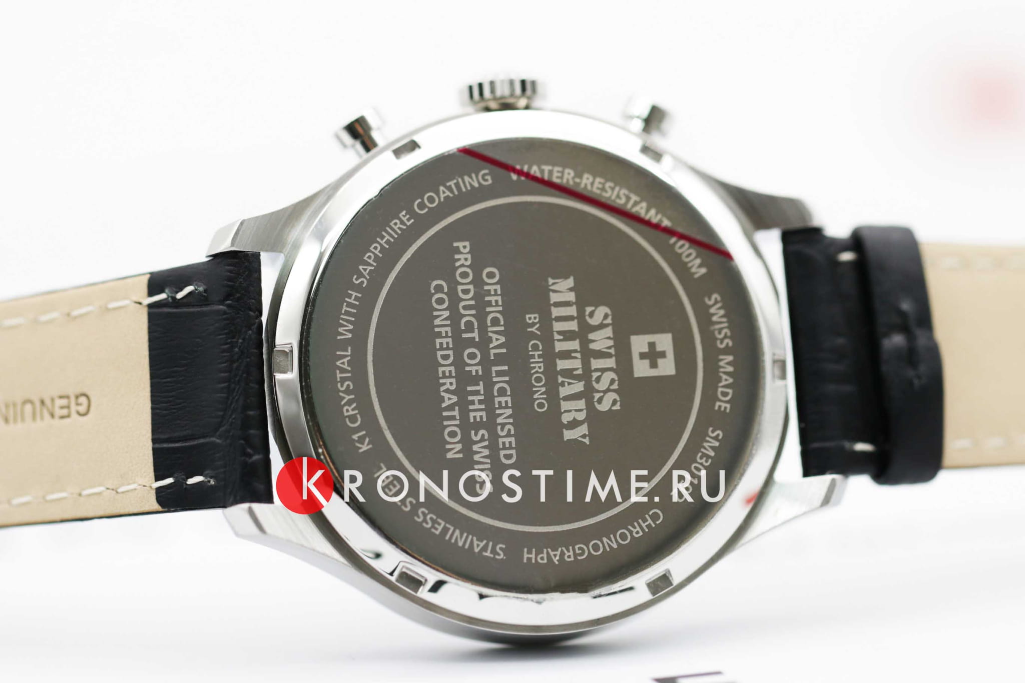 Мужские швейцарские наручные часы-хронографХронографФункция позволяет измерять отрезки времени с особой точностью: часы, минуты, секунды. Верным признаком хронографа является наличие на циферблате 3 дополнительных окошек-счётчиков. Swiss Military by Chrono SM30192.08, кварцевый механизм с высокой точностью. Класс водозащиты: 100 метров, позволит плавать, нырять и заниматься другими водными видами спорта. Корпус часов изготовлен из стали серебристого цвета. Апертура даты в позиции 6 часов. Черный кожаный ремешок с классической пряжкой. Модель оснащена секундомеромСекундомерСекундоме́р — прибор, способный измерять интервалы времени с точностью до долей секунды.. Стрелки и метки с люминесцентной подсветкойЛюминесцентное покрытиеПозволяет считывать показания времени в темноте. Производители наносят на стрелки, часовые индексы, безель или поверхность циферблата светонакопительный состав, дающий холодное свечение..