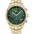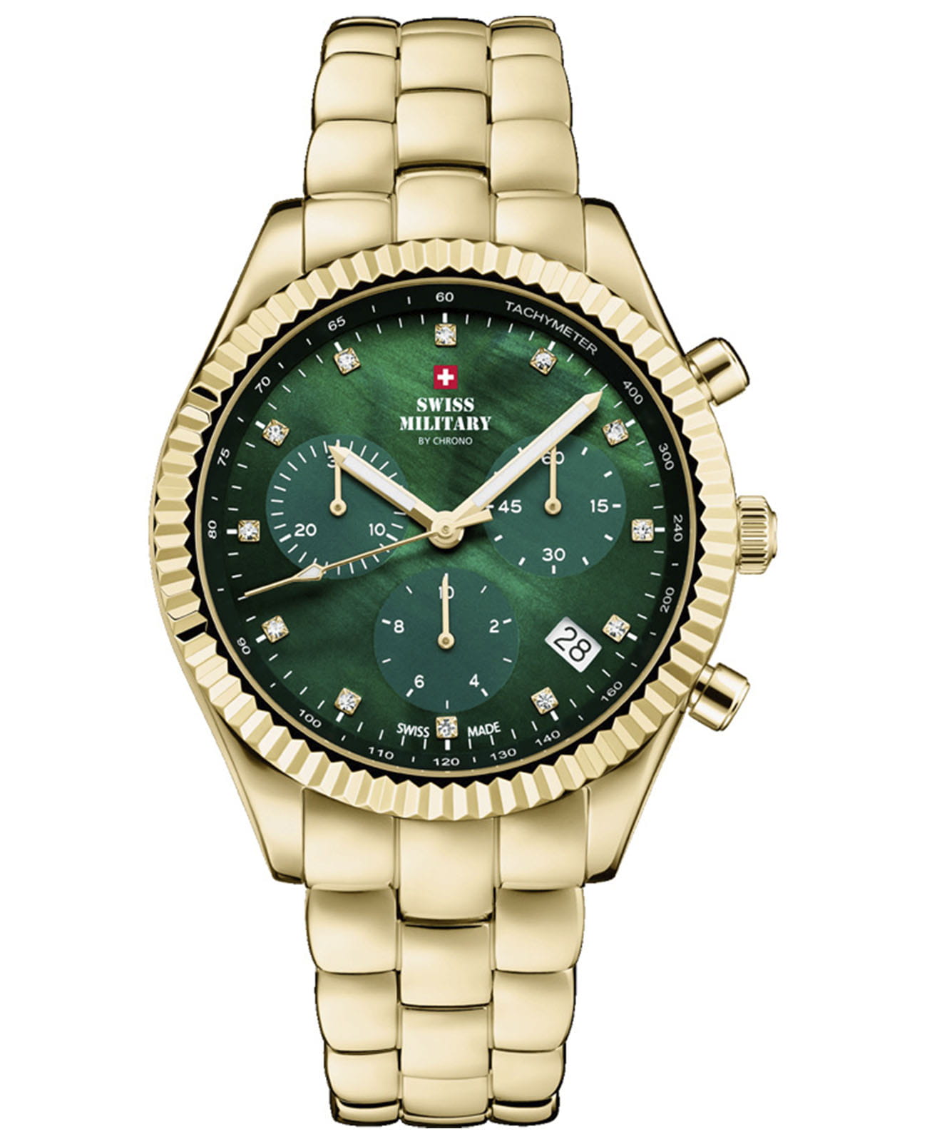 Женские швейцарские часы хронографХронографФункция позволяет измерять отрезки времени с особой точностью: часы, минуты, секунды. Верным признаком хронографа является наличие на циферблате 3 дополнительных окошек-счётчиков. с секундомеромСекундомерСекундоме́р — прибор, способный измерять интервалы времени с точностью до долей секунды. Swiss Military by Chrono Elegant Sports SM30207.04 , кварцевый механизм с высокой точностью. Cапфировое стеклоСапфировое стеклоПрочный и надёжный материал из кристалла сапфира синтетического происхождения, характеризующийся особой твёрдостью и устойчивостью к царапинам и повреждениям. устойчивое к появлению царапин и обладающее высокой прозрачностью. На циферблате расположены три дополнительных индикатора и окошко даты. Метки на циферблате украшены кристаллами. Неподвижный безельБезельВнешний ободок, закрепляющий стекло. В спортивных часах так называется поворотное кольцо с делениями на циферблате, выполняет роль таймера – замеряет отрезки времени на шкале. Неподвижный безель – элемент декора. Однонаправленно вращающийся безель на дайверских часах позволяет фиксировать моменты погружения и выныривания на поверхность. из нержавеющей стали с PVDPVDУльтратонкое покрытие наносится в технике вакуумного напыления, сочетает в себе нитрид титана особой прочности со слоем золота или оксида хрома. Несёт в себе декоративную или защитную функцию. покрытием и со шкалой тахиметрТахиметрРазмеченная шкала, располагается на ободке или безеле часов. Тахиметр позволяет рассчитать скорость на определённом участке пути, расстояние измеряется в километрах или милях.. Стрелки с люминесцентным покрытиемЛюминесцентное покрытиеПозволяет считывать показания времени в темноте. Производители наносят на стрелки, часовые индексы, безель или поверхность циферблата светонакопительный состав, дающий холодное свечение.. Класс водозащиты: 50 метров, позволит защитить корпус от случайных брызг или капель дождя. Корпус и браслет часов изготовлен из нержавеющей стали с PVDPVDУльтратонкое покрытие наносится в технике вакуумного напыления, сочетает в себе нитрид титана особой прочности со слоем золота или оксида хрома. Несёт в себе декоративную или защитную функцию. покрытием. Стальной браслет на раскладной застёжкеРаскладная застёжкаТакой тип застёжки используется только на браслетах из металла. Она никогда не раскрывается полностью, происходит разделение на 2 и более частей. Раскладывающая застёжка снизит вероятность потери часов к минимуму..