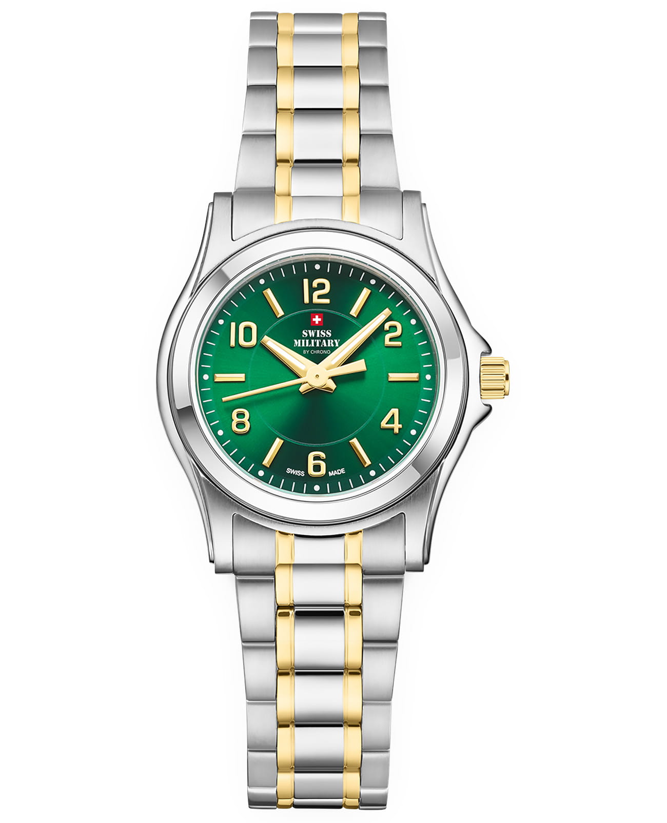 Женские швейцарские наручные часы Swiss Military by Chrono SM34003.28, кварцевый механизм с высокой точностью. Класс водозащиты: 50 метров, позволит защитить корпус от случайных брызг или капель дождя. Стрелки и метки с люминесцентным покрытиемЛюминесцентное покрытиеПозволяет считывать показания времени в темноте. Производители наносят на стрелки, часовые индексы, безель или поверхность циферблата светонакопительный состав, дающий холодное свечение.. Корпус часов изготовлен из стали. Минеральное стеклоМинеральное стеклоМинеральное стекло представляет собой искусственно выращенный минерал кварца. Такое стекло отличается особой устойчивостью к повреждениям и царапинам. Уступает по некоторым качествам сапфировому стеклу.. Браслет с частичным PVD-покрытиемPVDУльтратонкое покрытие наносится в технике вакуумного напыления, сочетает в себе нитрид титана особой прочности со слоем золота или оксида хрома. Несёт в себе декоративную или защитную функцию. и с раскладной застёжкойРаскладная застёжкаТакой тип застёжки используется только на браслетах из металла. Она никогда не раскрывается полностью, происходит разделение на 2 и более частей. Раскладывающая застёжка снизит вероятность потери часов к минимуму..