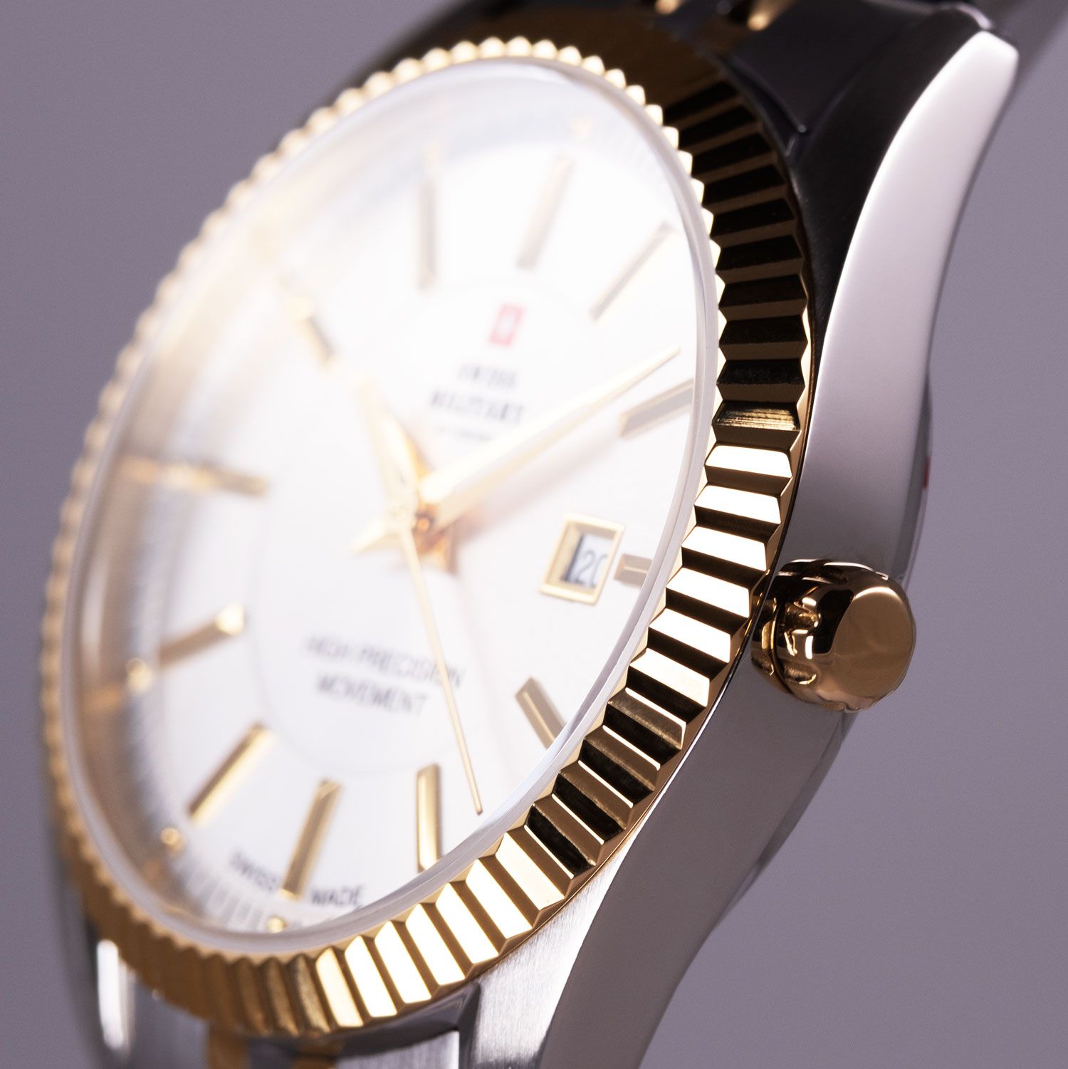 Женские швейцарские наручные часы Swiss Military by Chrono SM34066.05, кварцевый механизм с высокой точностью. Минеральное стеклоМинеральное стеклоМинеральное стекло представляет собой искусственно выращенный минерал кварца. Такое стекло отличается особой устойчивостью к повреждениям и царапинам. Уступает по некоторым качествам сапфировому стеклу. устойчивое к появлению царапин, обладающее высокой прозрачностью. Класс водозащиты: 50 метров, позволит защитить корпус от случайных брызг или капель дождя. Корпус часов изготовлен из стали.БезельБезельВнешний ободок, закрепляющий стекло. В спортивных часах так называется поворотное кольцо с делениями на циферблате, выполняет роль таймера – замеряет отрезки времени на шкале. Неподвижный безель – элемент декора. Однонаправленно вращающийся безель на дайверских часах позволяет фиксировать моменты погружения и выныривания на поверхность. с PVD-покрытиемPVDУльтратонкое покрытие наносится в технике вакуумного напыления, сочетает в себе нитрид титана особой прочности со слоем золота или оксида хрома. Несёт в себе декоративную или защитную функцию.. Браслет с раскладной застёжкойРаскладная застёжкаТакой тип застёжки используется только на браслетах из металла. Она никогда не раскрывается полностью, происходит разделение на 2 и более частей. Раскладывающая застёжка снизит вероятность потери часов к минимуму. и с частичным PVD-покрытиемPVDУльтратонкое покрытие наносится в технике вакуумного напыления, сочетает в себе нитрид титана особой прочности со слоем золота или оксида хрома. Несёт в себе декоративную или защитную функцию..