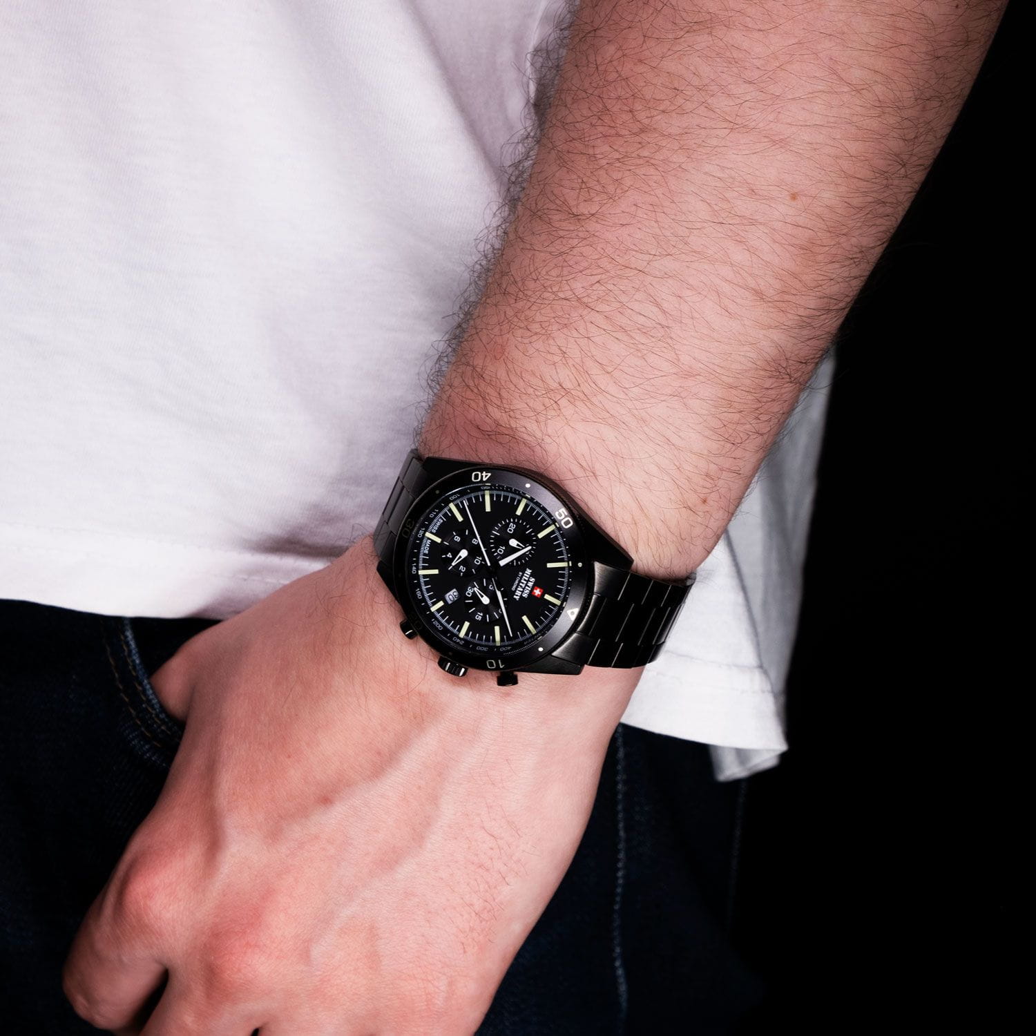 Часы-хронографХронографФункция позволяет измерять отрезки времени с особой точностью: часы, минуты, секунды. Верным признаком хронографа является наличие на циферблате 3 дополнительных окошек-счётчиков. с секундомеромСекундомерСекундоме́р — прибор, способный измерять интервалы времени с точностью до долей секунды.. Кварцевый механизм с высокой точностью. минеральное стеклоМинеральное стеклоМинеральное стекло представляет собой искусственно выращенный минерал кварца. Такое стекло отличается особой устойчивостью к повреждениям и царапинам. Уступает по некоторым качествам сапфировому стеклу. устойчивое к появлению царапин, обладающее высокой прозрачностью. Стрелки и метки с люминесцентным покрытиемЛюминесцентное покрытиеПозволяет считывать показания времени в темноте. Производители наносят на стрелки, часовые индексы, безель или поверхность циферблата светонакопительный состав, дающий холодное свечение.. Класс водозащиты: 100 метров, позволит плавать, нырять и заниматься другими водными видами спорта. Корпус и безельБезельВнешний ободок, закрепляющий стекло. В спортивных часах так называется поворотное кольцо с делениями на циферблате, выполняет роль таймера – замеряет отрезки времени на шкале. Неподвижный безель – элемент декора. Однонаправленно вращающийся безель на дайверских часах позволяет фиксировать моменты погружения и выныривания на поверхность. часов изготовлены из нержавеющей стали с PVD-покрытиемPVDУльтратонкое покрытие наносится в технике вакуумного напыления, сочетает в себе нитрид титана особой прочности со слоем золота или оксида хрома. Несёт в себе декоративную или защитную функцию.. Браслет с раскладной застёжкойРаскладная застёжкаТакой тип застёжки используется только на браслетах из металла. Она никогда не раскрывается полностью, происходит разделение на 2 и более частей. Раскладывающая застёжка снизит вероятность потери часов к минимуму..