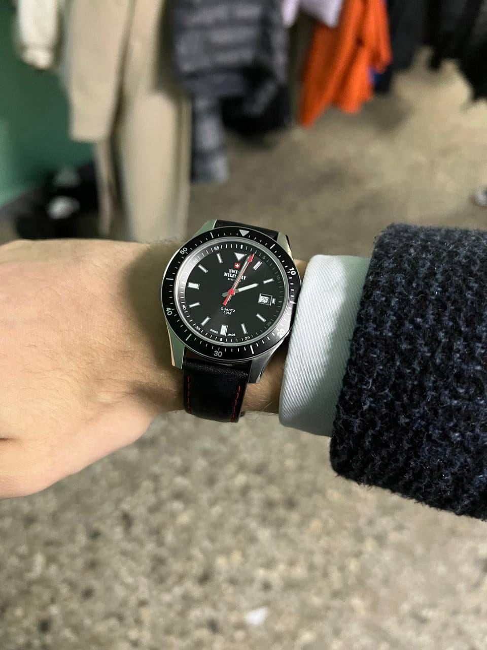 Ремешок из натуральной чёрной кожи с красной строчкой и классической застёжкой подчёркивает спортивный характер часов, обеспечивая комфортное ношение. Водозащита до 5 ATM делает модель подходящей для повседневного использования, включая случайные контакты с водой.