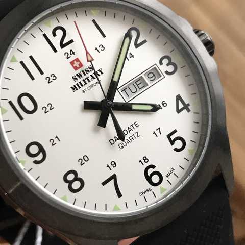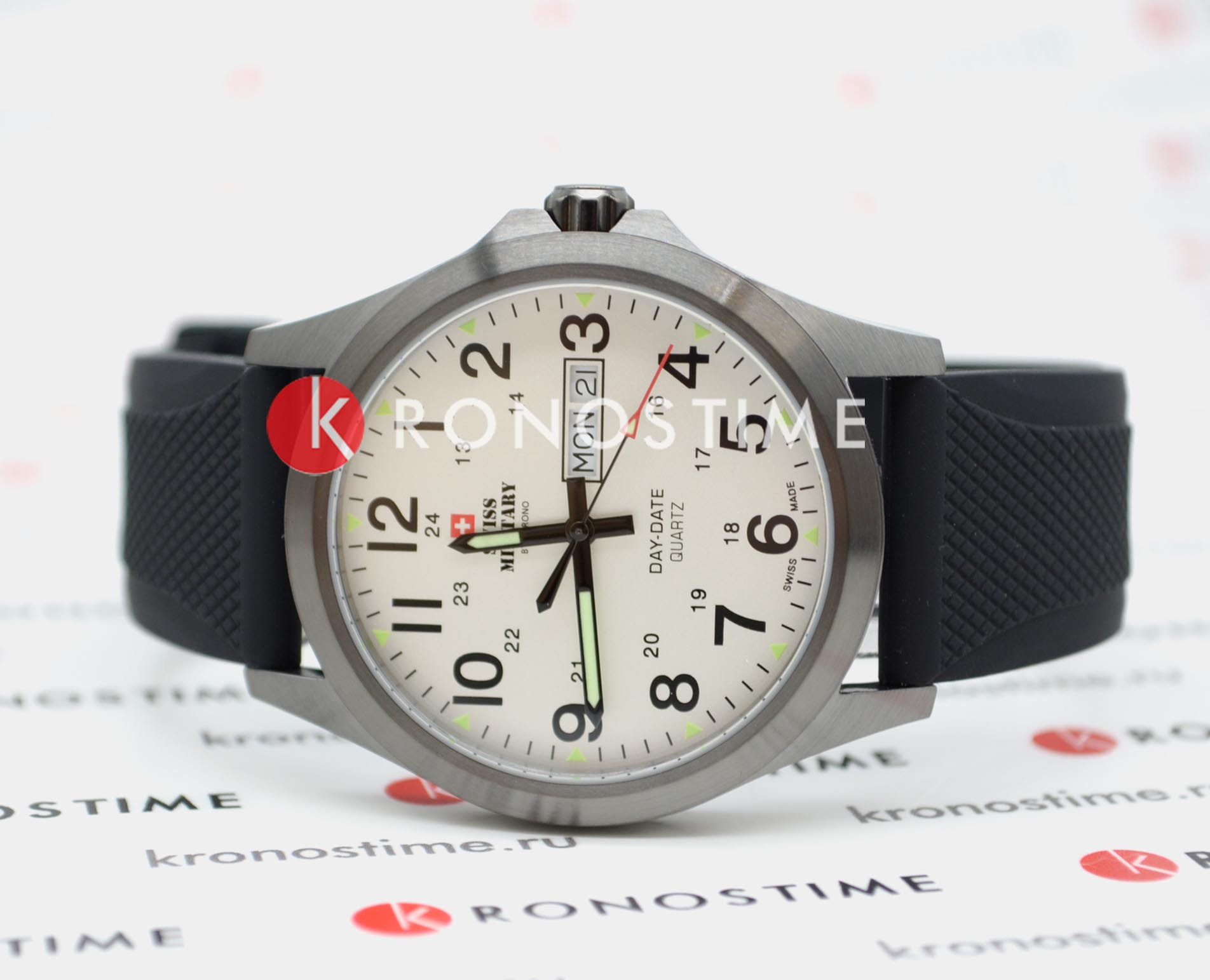 Мужские швейцарские наручные часы с минеральным стекломМинеральное стеклоМинеральное стекло представляет собой искусственно выращенный минерал кварца. Такое стекло отличается особой устойчивостью к повреждениям и царапинам. Уступает по некоторым качествам сапфировому стеклу. Swiss Military by Chrono Day Date SMP36040.20, кварцевый механизм с высокой точностью. Класс водозащиты: 50 метров, позволит защитить корпус от случайных брызг или капель дождя. Корпус часов изготовлен из стали нержавеющей с PVDPVDУльтратонкое покрытие наносится в технике вакуумного напыления, сочетает в себе нитрид титана особой прочности со слоем золота или оксида хрома. Несёт в себе декоративную или защитную функцию. покрытием. Стрелки и метки с люминесцентной подсветкойЛюминесцентное покрытиеПозволяет считывать показания времени в темноте. Производители наносят на стрелки, часовые индексы, безель или поверхность циферблата светонакопительный состав, дающий холодное свечение.. Каучуковый ремешок на стандартной застежке.