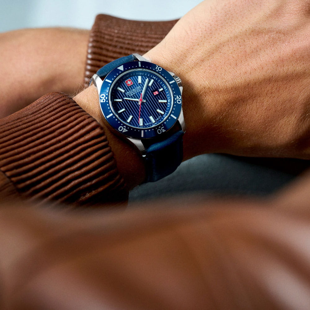 Мужские швейцарские часы с сапфировым стекломСапфировое стеклоПрочный и надёжный материал из кристалла сапфира синтетического происхождения, характеризующийся особой твёрдостью и устойчивостью к царапинам и повреждениям. Swiss Military Hanowa Flagship X SMWGB2100607, кварцевый механизм с высокой точностью. Сапфировое стеклоСапфировое стеклоПрочный и надёжный материал из кристалла сапфира синтетического происхождения, характеризующийся особой твёрдостью и устойчивостью к царапинам и повреждениям. устойчивое к появлению царапин, обладающее высокой прозрачностью. Класс водозащиты: 100 метров, позволит плавать, нырять и заниматься другими водными видами спорта. Корпус часов изготовлен из стали. Циферблат украшен рельефным декоративным узором в виде вертикальных линий и дополнен фирменным логотипом Swiss Military Hanowa в положении 12 часов. Заостренные прямоугольные стрелки и метки с люминесцентным покрытиемЛюминесцентное покрытиеПозволяет считывать показания времени в темноте. Производители наносят на стрелки, часовые индексы, безель или поверхность циферблата светонакопительный состав, дающий холодное свечение., которое светится в темноте после непродолжительной зарядки на свету. Окошко даты находится в положении 3 часа. Метки в виде штрихов. Рифленая заводная головка с защитой, украшена фирменным логотипом. Удобный ремешок из натуральной кожи с классической застежкой.
