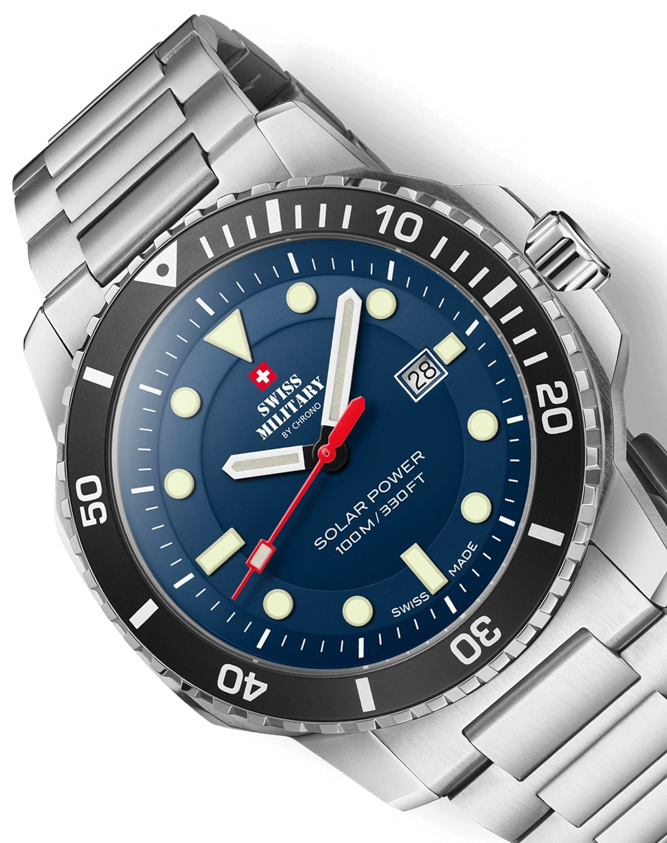 Модель SMS34102.02 от Swiss Military by Chrono — это надёжные швейцарские спортивные часы, сочетающие в себе прочность, функциональность и элегантный дизайн. Корпус и браслет выполнены из нержавеющей стали, подчёркивая прочность и элегантность конструкции. Циферблат с солнечным узором и крупными метками, покрытыми люминесцентным покрытиемЛюминесцентное покрытиеПозволяет считывать показания времени в темноте. Производители наносят на стрелки, часовые индексы, безель или поверхность циферблата светонакопительный состав, дающий холодное свечение., обеспечивает отличную читаемость в любых условиях. Часы оснащены швейцарским солнечным кварцевым механизмом Ronda Solartech Caliber 215, обеспечивающим точный ход и запас хода до 8 месяцев без подзарядки. Циферблат защищён сапфировым стекломСапфировое стеклоПрочный и надёжный материал из кристалла сапфира синтетического происхождения, характеризующийся особой твёрдостью и устойчивостью к царапинам и повреждениям., устойчивым к царапинам. Установлена раскладная застёжкаРаскладная застёжкаТакой тип застёжки используется только на браслетах из металла. Она никогда не раскрывается полностью, происходит разделение на 2 и более частей. Раскладывающая застёжка снизит вероятность потери часов к минимуму. для надёжной фиксации на запястье. Односторонний вращающийся безель с PVD-покрытиемPVDУльтратонкое покрытие наносится в технике вакуумного напыления, сочетает в себе нитрид титана особой прочности со слоем золота или оксида хрома. Несёт в себе декоративную или защитную функцию. позволяет точно отслеживать время. Модель обладает водонепроницаемостью до 100 метров, что делает её подходящей для плавания и сноркелинга.