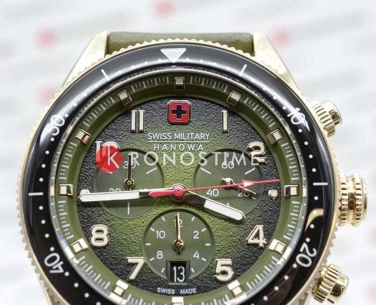 Мужские наручные часы-хронографХронографФункция позволяет измерять отрезки времени с особой точностью: часы, минуты, секунды. Верным признаком хронографа является наличие на циферблате 3 дополнительных окошек-счётчиков. Swiss Military Hanowa SMWGC0003802 из коллекции Greyhound Chrono сочетают в себе спортивный дизайн и надежность современных технологий. Модель обладает круглым корпусом диаметром 45 мм, изготовленным из нержавеющей стали, что обеспечивает высокую устойчивость к внешним воздействиям. Для защиты циферблата используется сапфировое стеклоСапфировое стеклоПрочный и надёжный материал из кристалла сапфира синтетического происхождения, характеризующийся особой твёрдостью и устойчивостью к царапинам и повреждениям., гарантирующее прочную защиту от царапин. БезельБезельВнешний ободок, закрепляющий стекло. В спортивных часах так называется поворотное кольцо с делениями на циферблате, выполняет роль таймера – замеряет отрезки времени на шкале. Неподвижный безель – элемент декора. Однонаправленно вращающийся безель на дайверских часах позволяет фиксировать моменты погружения и выныривания на поверхность. с IP-покрытиемIP-покрытиеМетод ионного напыления. Демонстрирует повышенную устойчивость к истиранию, окислению и химическим веществам. Под воздействием высокого давления и температуры около 1500°C молекулы металла надёжно соединяются с частицами корпуса часов.. Часы оснащены высококачественным швейцарским кварцевым механизмом Ronda 5030, который позволяет точно измерять время благодаря функции секундомераСекундомерСекундоме́р — прибор, способный измерять интервалы времени с точностью до долей секунды.. Циферблат украшен метками в виде арабских цифр и точек, а стрелки и метки покрыты люминесцентным покрытиемЛюминесцентное покрытиеПозволяет считывать показания времени в темноте. Производители наносят на стрелки, часовые индексы, безель или поверхность циферблата светонакопительный состав, дающий холодное свечение., что обеспечивает удобство чтения времени в темноте. Ремешок часов выполнен из натуральной кожи, что добавляет комфорта при длительном ношении. Модель также оснащена окном даты в положении «6 часов», завинчивающейся заводной головкой и имеет водонепроницаемость до 10 атмосфер (100 метров), что позволяет использовать их во время плавания и других водных видов спорта.