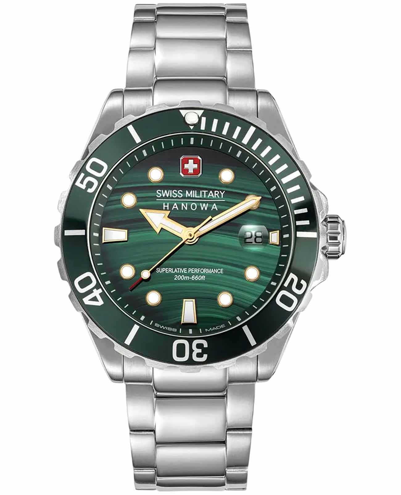 Swiss Military Hanowa Greyhound SMWGH0005804 — воплощение швейцарского качества и элегантного дизайна. Лимитированная серия — 444 экземпляра. Эти часы идеально подойдут для уверенного в себе мужчины, ценящего стиль и надежность. Корпус часов выполнен из нержавеющей стали, что придает им современный и мужественный вид. Диаметр корпуса составляет 44 мм, что делает их универсальным аксессуаром для любого случая. Циферблат из натурального малахита, метки и стрелки светятся в темноте благодаря люминесцентному покрытиюЛюминесцентное покрытиеПозволяет считывать показания времени в темноте. Производители наносят на стрелки, часовые индексы, безель или поверхность циферблата светонакопительный состав, дающий холодное свечение. обеспечивает отличную читаемость и подчеркивает строгий стиль модели. Сапфировое стеклоСапфировое стеклоПрочный и надёжный материал из кристалла сапфира синтетического происхождения, характеризующийся особой твёрдостью и устойчивостью к царапинам и повреждениям. защищает циферблат от царапин и повреждений, гарантируя долгий срок службы и сохранение первоначального внешнего вида часов. Часы оснащены надежным кварцевым механизмом, который обеспечивает высокую точность хода. Водозащита на уровне 200WR позволит плавать, нырять и заниматься другими водными видами спорта. Вращающийся в одном направлении рифленый безельБезельВнешний ободок, закрепляющий стекло. В спортивных часах так называется поворотное кольцо с делениями на циферблате, выполняет роль таймера – замеряет отрезки времени на шкале. Неподвижный безель – элемент декора. Однонаправленно вращающийся безель на дайверских часах позволяет фиксировать моменты погружения и выныривания на поверхность. с IP-покрытиемIP-покрытиеМетод ионного напыления. Демонстрирует повышенную устойчивость к истиранию, окислению и химическим веществам. Под воздействием высокого давления и температуры около 1500°C молекулы металла надёжно соединяются с частицами корпуса часов.. Стальной браслет на раскладной застёжкеРаскладная застёжкаТакой тип застёжки используется только на браслетах из металла. Она никогда не раскрывается полностью, происходит разделение на 2 и более частей. Раскладывающая застёжка снизит вероятность потери часов к минимуму. обеспечивает комфортное ношение на запястье.