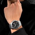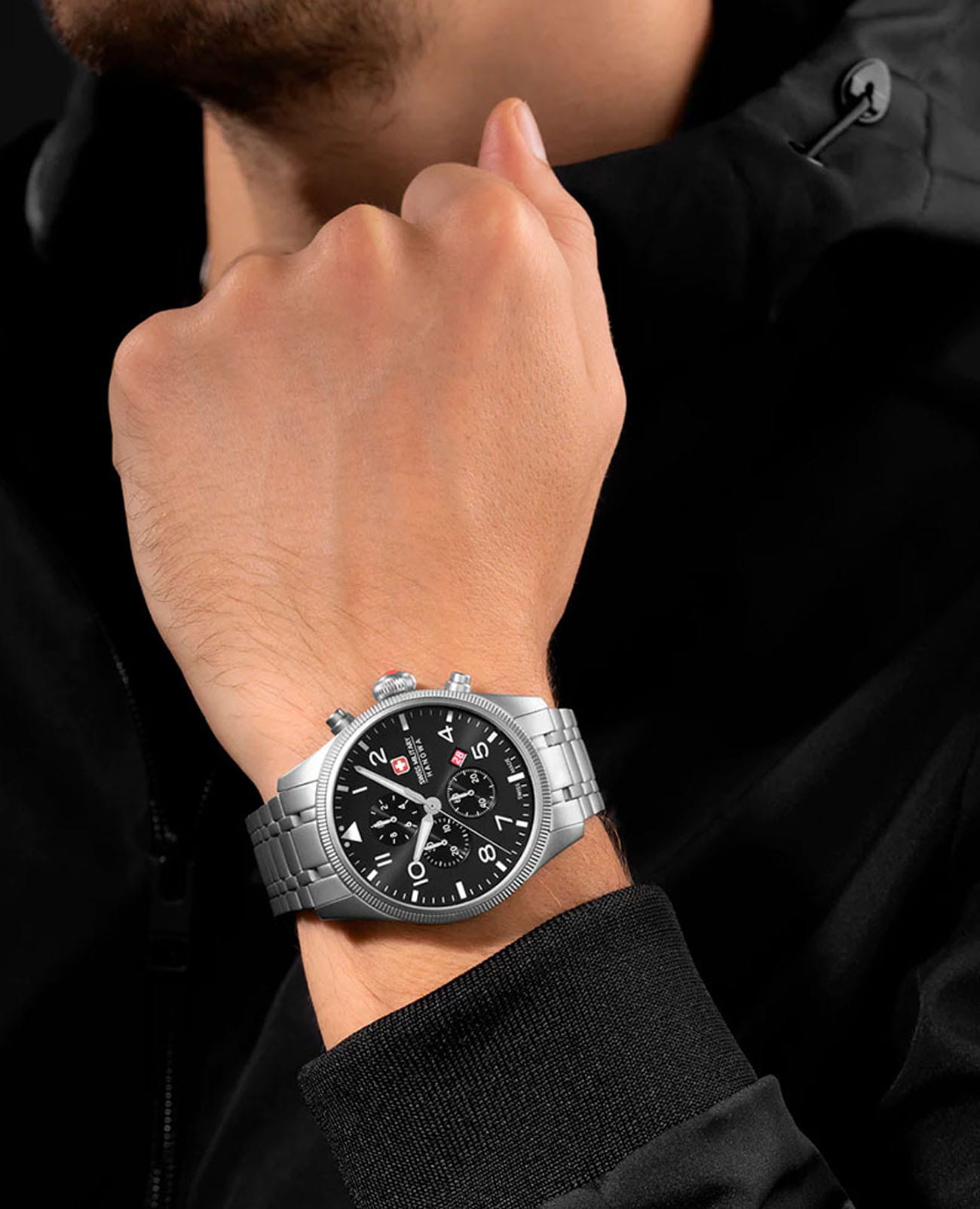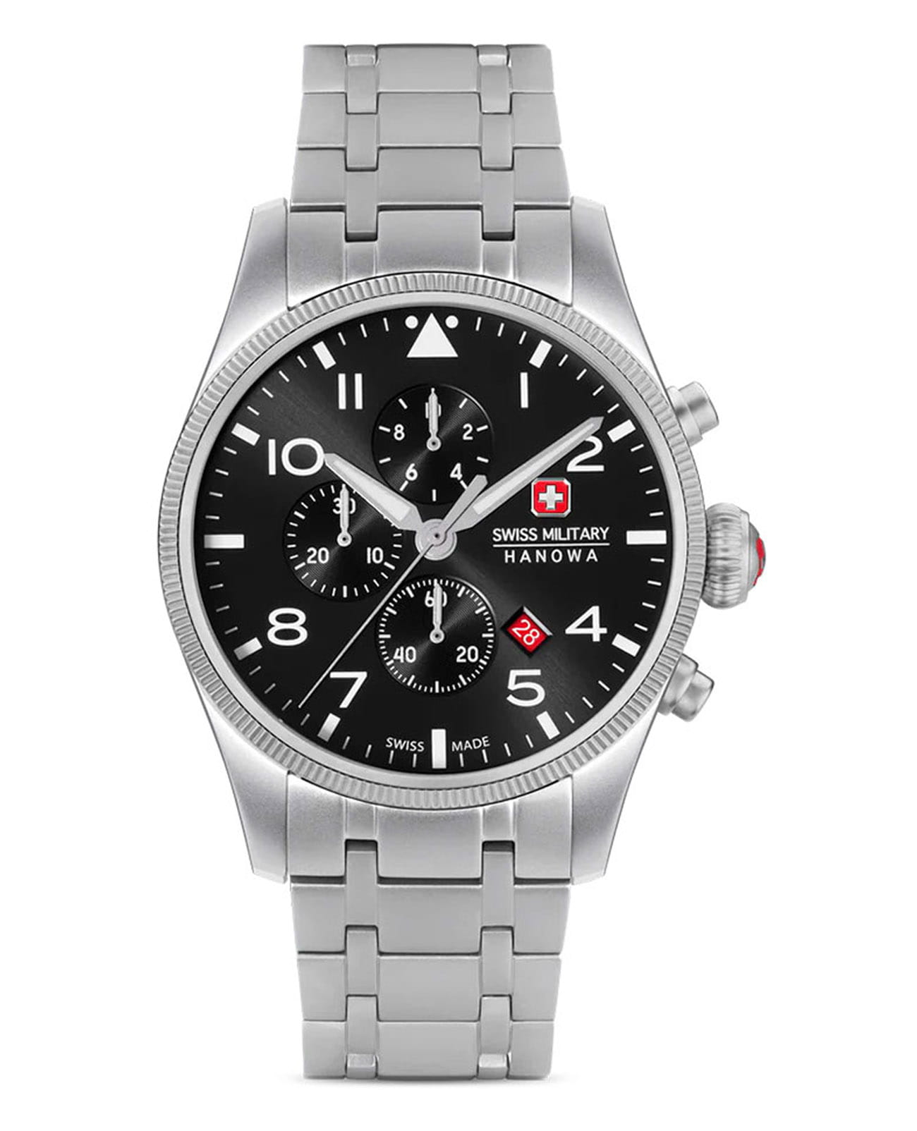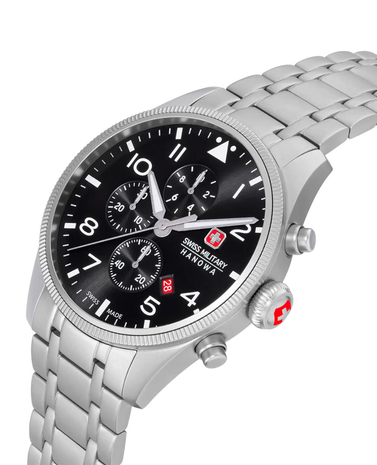 Мужские швейцарские часы-хронографХронографФункция позволяет измерять отрезки времени с особой точностью: часы, минуты, секунды. Верным признаком хронографа является наличие на циферблате 3 дополнительных окошек-счётчиков. Swiss Military Hanowa Thunderbolt Chrono SMWGI0000405, кварцевый механизм с высокой точностью. Сапфировое стеклоСапфировое стеклоПрочный и надёжный материал из кристалла сапфира синтетического происхождения, характеризующийся особой твёрдостью и устойчивостью к царапинам и повреждениям. устойчивое к появлению царапин, обладающее высокой прозрачностью. Секундная стрелка вынесена на малый циферблат. Стрелки с люминесцентным покрытиемЛюминесцентное покрытиеПозволяет считывать показания времени в темноте. Производители наносят на стрелки, часовые индексы, безель или поверхность циферблата светонакопительный состав, дающий холодное свечение.. Окошко даты находится в положении между 4 и 5 часов. Класс водозащиты: 100 метров, позволит плавать, нырять и заниматься другими водными видами спорта. Стальной браслет на раскладной застёжкеРаскладная застёжкаТакой тип застёжки используется только на браслетах из металла. Она никогда не раскрывается полностью, происходит разделение на 2 и более частей. Раскладывающая застёжка снизит вероятность потери часов к минимуму..