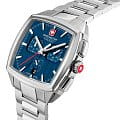 Часы Swiss Military Hanowa Starlight Chrono SMWGI0004302 сочетают современный дизайн с высокой функциональностью. Квадратный корпус диаметром 40 мм выполнен из нержавеющей стали, а синий циферблат защищён сапфировым стекломСапфировое стеклоПрочный и надёжный материал из кристалла сапфира синтетического происхождения, характеризующийся особой твёрдостью и устойчивостью к царапинам и повреждениям., устойчивым к царапинам.