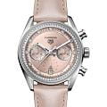Роскошная версия шикарных TAG Heuer Carrera Chronograph CBS2215.FC6568 с бриллиантами. Престижные часы TAG Heuer Carrera сочетают в себе производительность и поразительную роскошь, создавая воодушевляющий и непринужденный элегантный образ. Часы оснащены мануфактурным механизмом TAG Heuer TH20-00. Утончённый циферблат пудрового розового цвета являет собой совершенную форму часового искусства. На матовом и полированном корпусе из стали можно увидеть сапфировое стеклоСапфировое стеклоПрочный и надёжный материал из кристалла сапфира синтетического происхождения, характеризующийся особой твёрдостью и устойчивостью к царапинам и повреждениям.. Элегантный циферблат дополняют индексы из 11 бриллиантов и роскошный безельБезельВнешний ободок, закрепляющий стекло. В спортивных часах так называется поворотное кольцо с делениями на циферблате, выполняет роль таймера – замеряет отрезки времени на шкале. Неподвижный безель – элемент декора. Однонаправленно вращающийся безель на дайверских часах позволяет фиксировать моменты погружения и выныривания на поверхность. из полированной стали с 72 бриллиантами. Ремень с раскладной застёжкойРаскладная застёжкаТакой тип застёжки используется только на браслетах из металла. Она никогда не раскрывается полностью, происходит разделение на 2 и более частей. Раскладывающая застёжка снизит вероятность потери часов к минимуму.. Часы с люминесцентным покрытиемЛюминесцентное покрытиеПозволяет считывать показания времени в темноте. Производители наносят на стрелки, часовые индексы, безель или поверхность циферблата светонакопительный состав, дающий холодное свечение. с хронографом ХронографФункция позволяет измерять отрезки времени с особой точностью: часы, минуты, секунды. Верным признаком хронографа является наличие на циферблате 3 дополнительных окошек-счётчиков. и секундомеромСекундомерСекундоме́р — прибор, способный измерять интервалы времени с точностью до долей секунды..