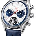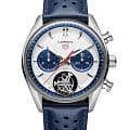 Механические часы-хронографХронографФункция позволяет измерять отрезки времени с особой точностью: часы, минуты, секунды. Верным признаком хронографа является наличие на циферблате 3 дополнительных окошек-счётчиков. TAG Heuer Carrera Chronograph Tourbillon CBS5013.EB0375. Автоматический механизм с высокой точностью. Класс водозащиты: 100 метров, позволит плавать, нырять и заниматься другими водными видами спорта. Сапфировое стеклоСапфировое стеклоПрочный и надёжный материал из кристалла сапфира синтетического происхождения, характеризующийся особой твёрдостью и устойчивостью к царапинам и повреждениям. устойчивое к появлению царапин, обладающее высокой прозрачностью. Стрелки с люминесцентным покрытиемЛюминесцентное покрытиеПозволяет считывать показания времени в темноте. Производители наносят на стрелки, часовые индексы, безель или поверхность циферблата светонакопительный состав, дающий холодное свечение.. Корпус часов изготовлен из нержавеющей стали. Кожаный ремешок с раскладной застёжкойРаскладная застёжкаТакой тип застёжки используется только на браслетах из металла. Она никогда не раскрывается полностью, происходит разделение на 2 и более частей. Раскладывающая застёжка снизит вероятность потери часов к минимуму.. Ограниченная серия из 50 штук.