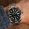 Автоматические мужские часы TAG Heuer Aquaracer Calibre 5 Automatic WAY201A.BA0927, механический механизм (автоматический калибр) с высокой точностью. Сапфировое стеклоСапфировое стеклоПрочный и надёжный материал из кристалла сапфира синтетического происхождения, характеризующийся особой твёрдостью и устойчивостью к царапинам и повреждениям. устойчивое к появлению царапин, обладающее высокой прозрачностью. Класс водозащиты: 300 метров, позволит плавать, нырять и заниматься другими водными видами спорта. Корпус часов изготовлен из стали. Стальной браслет на раскладной застёжкеРаскладная застёжкаТакой тип застёжки используется только на браслетах из металла. Она никогда не раскрывается полностью, происходит разделение на 2 и более частей. Раскладывающая застёжка снизит вероятность потери часов к минимуму.. В механизме 25 или 26 камней в зависимости от исполнения, частота 28800 полуколебаний в час. Запас хода 38 часов. Окошко даты с увеличительным стеклом. Керамический безельБезельВнешний ободок, закрепляющий стекло. В спортивных часах так называется поворотное кольцо с делениями на циферблате, выполняет роль таймера – замеряет отрезки времени на шкале. Неподвижный безель – элемент декора. Однонаправленно вращающийся безель на дайверских часах позволяет фиксировать моменты погружения и выныривания на поверхность. вращается в одном направлении. Завинчивающаяся заводная головка с защитой. Завинчивающаяся задняя крышка. Накладные полированные граненые индексы с родиевым покрытием. Стрелки и метки с люминесцентным покрытиемЛюминесцентное покрытиеПозволяет считывать показания времени в темноте. Производители наносят на стрелки, часовые индексы, безель или поверхность циферблата светонакопительный состав, дающий холодное свечение..