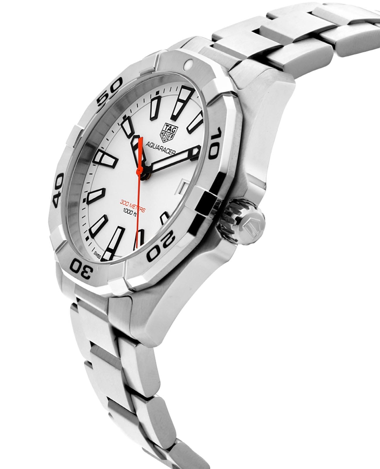 Мужские наручные часы TAG Heuer Aquaracer WBD1111.BA0928 с надёжным автоматическим механизмом. Корпус часов изготовлен из нержавеющей стали. Сапфировое стеклоСапфировое стеклоПрочный и надёжный материал из кристалла сапфира синтетического происхождения, характеризующийся особой твёрдостью и устойчивостью к царапинам и повреждениям. с антибликовым покрытием, устойчивое к мелким механическим повреждениям. Стальной браслет на раскладной застёжкеРаскладная застёжкаТакой тип застёжки используется только на браслетах из металла. Она никогда не раскрывается полностью, происходит разделение на 2 и более частей. Раскладывающая застёжка снизит вероятность потери часов к минимуму.. Стрелки и метки с люминесцентным покрытиемЛюминесцентное покрытиеПозволяет считывать показания времени в темноте. Производители наносят на стрелки, часовые индексы, безель или поверхность циферблата светонакопительный состав, дающий холодное свечение.. Окошко даты находится в положении 3 часа. Вращающийся стальной безельБезельВнешний ободок, закрепляющий стекло. В спортивных часах так называется поворотное кольцо с делениями на циферблате, выполняет роль таймера – замеряет отрезки времени на шкале. Неподвижный безель – элемент декора. Однонаправленно вращающийся безель на дайверских часах позволяет фиксировать моменты погружения и выныривания на поверхность.. Класс водозащиты: 300 метров, позволит плавать, нырять и заниматься другими водными видами спорта.