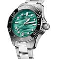 Механический механизм (автоматический калибр) с высокой точностью. Сапфировое стеклоСапфировое стеклоПрочный и надёжный материал из кристалла сапфира синтетического происхождения, характеризующийся особой твёрдостью и устойчивостью к царапинам и повреждениям. устойчивое к появлению царапин, обладающее высокой прозрачностью. Стрелки с люминесцентным покрытиемЛюминесцентное покрытиеПозволяет считывать показания времени в темноте. Производители наносят на стрелки, часовые индексы, безель или поверхность циферблата светонакопительный состав, дающий холодное свечение.. Вращающийся керамический безельБезельВнешний ободок, закрепляющий стекло. В спортивных часах так называется поворотное кольцо с делениями на циферблате, выполняет роль таймера – замеряет отрезки времени на шкале. Неподвижный безель – элемент декора. Однонаправленно вращающийся безель на дайверских часах позволяет фиксировать моменты погружения и выныривания на поверхность.. Класс водозащиты: 300 метров, позволит плавать, нырять и заниматься другими водными видами спорта. Корпус часов изготовлен из нержавеющей стали. Браслет с двойной застежкой с системой блокировки, открывающаяся нажатием кнопки.