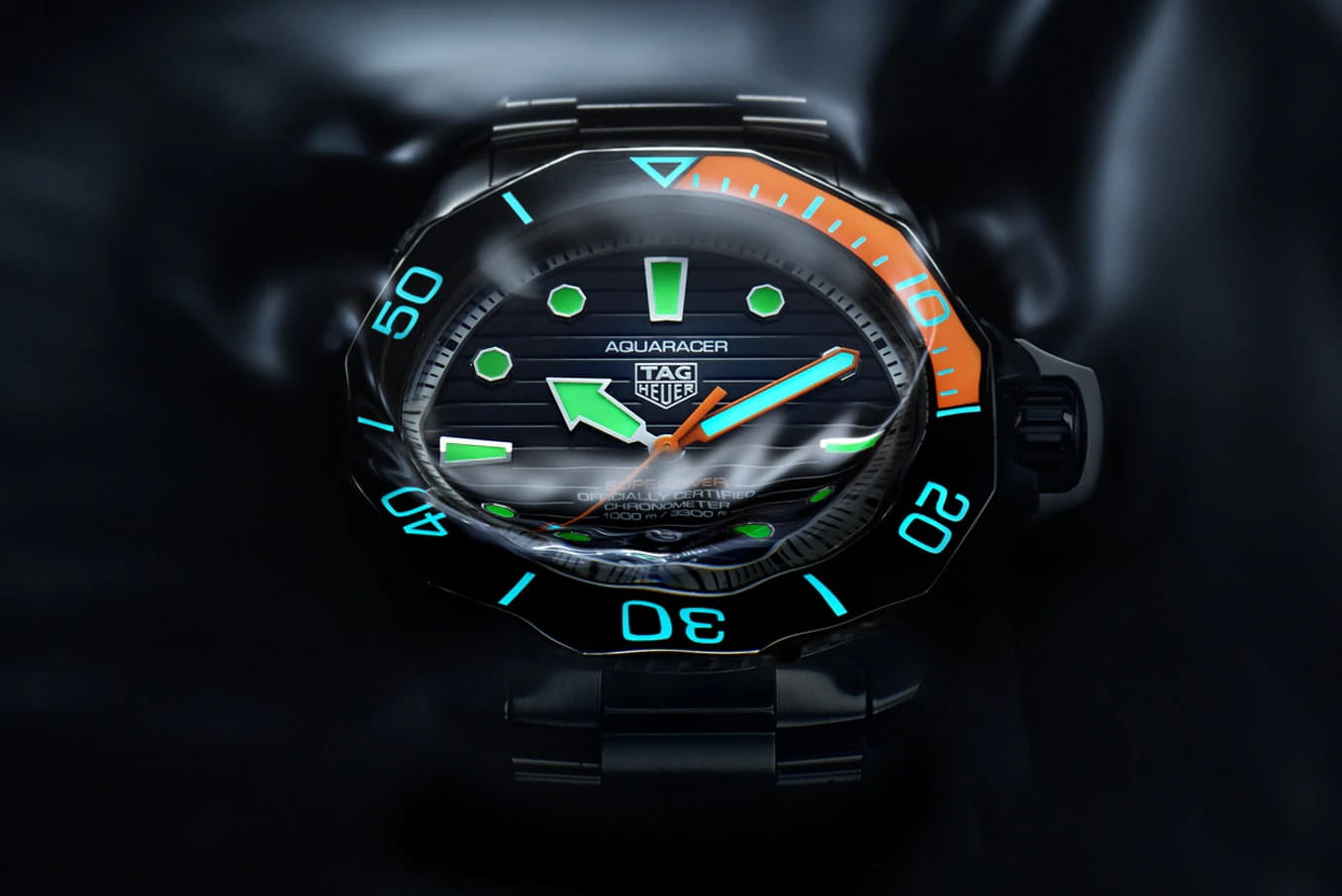 Мужские часы TAG Heuer Aquaracer Professional 200 Date WBP5A8A.BF0619 с 45-миллиметровым титановым корпусом оснащены защитой заводной головки и гелиевым выпускным клапаном, рассчитанным на погружение на глубину 1000 метров. Часы из титана, сертифицированные по стандарту ISO 6425:2018. Циферблат с люминесцентным покрытиемЛюминесцентное покрытиеПозволяет считывать показания времени в темноте. Производители наносят на стрелки, часовые индексы, безель или поверхность циферблата светонакопительный состав, дающий холодное свечение. стрелок и меток, дополнен сапфировым стекломСапфировое стеклоПрочный и надёжный материал из кристалла сапфира синтетического происхождения, характеризующийся особой твёрдостью и устойчивостью к царапинам и повреждениям., устойчивым к появлению царапин и обладающее высокой прозрачностью.