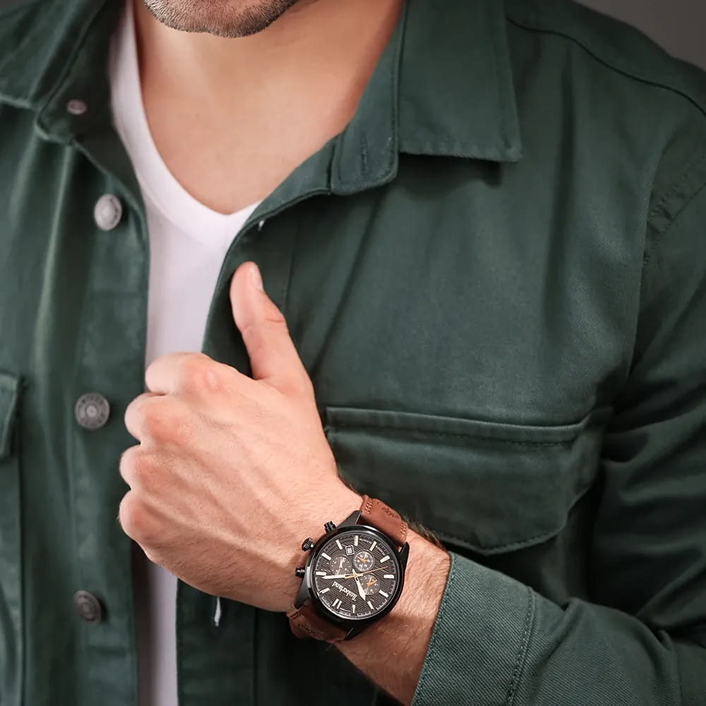 Американские мужские часы-хронографХронографФункция позволяет измерять отрезки времени с особой точностью: часы, минуты, секунды. Верным признаком хронографа является наличие на циферблате 3 дополнительных окошек-счётчиков. Timberland Northbridge TDWGF0009603 имеют кварцевый механизм с высокой точностью. Класс водозащиты: 50 метров, позволит защитить корпус от случайных брызг или капель дождя. 12-ти и 24-х часовой формат времени. Прочное минеральное стеклоМинеральное стеклоМинеральное стекло представляет собой искусственно выращенный минерал кварца. Такое стекло отличается особой устойчивостью к повреждениям и царапинам. Уступает по некоторым качествам сапфировому стеклу.. СекундомерСекундомерСекундоме́р — прибор, способный измерять интервалы времени с точностью до долей секунды.. Стрелки и метки циферблата с люминесцентным покрытиемЛюминесцентное покрытиеПозволяет считывать показания времени в темноте. Производители наносят на стрелки, часовые индексы, безель или поверхность циферблата светонакопительный состав, дающий холодное свечение.. Корпус часов изготовлен из стали с PVD-покрытиемPVDУльтратонкое покрытие наносится в технике вакуумного напыления, сочетает в себе нитрид титана особой прочности со слоем золота или оксида хрома. Несёт в себе декоративную или защитную функцию.. Кожаный ремешок с классической застежкой. Окошко даты находится в положении между 4 и 5 часов.
