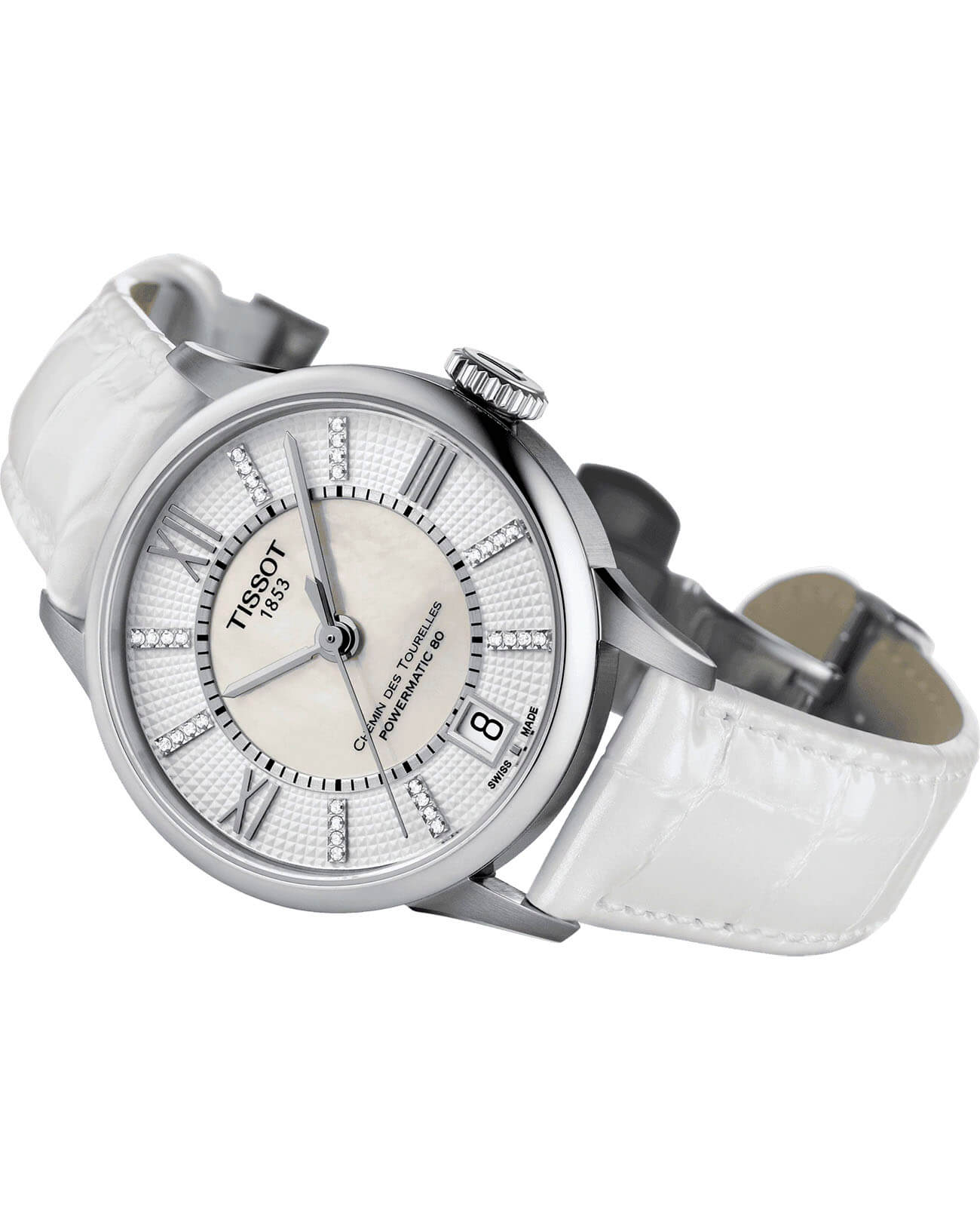 Утончённая модель имеет действительно шикарное исполнение циферблата с римскими цифрами, где лаконичность переплетается с великолепием и изяществом. По окружности он дополнен характерным для линейки узором, в середине расположена вставка из белого перламутра. Циферблат инкрустирован 32 бриллиантами цвета Top Wesselton в 0, 064 карат, их сияние никого не оставит равнодушным. Внутри корпуса из нержавеющей стали 316L находится автоматический механизм ETA Powermatic 80Powermatic 80Эксклюзивный калибр от швейцарской компании ETA с увеличенным запасом хода до 80 часов за счёт удлинённой заводной пружины. Характеризуется улучшенной системой спуска со сниженным трением. с запасом хода 80 часов. Движения деталей прослеживаются сквозь прозрачную заднюю крышку, оформленную узором «женевские волны». Стекло из сапфира с двусторонней антибликовой обработкой. Водонепроницаемость до 5 бар. . Апертура даты. Габариты: 32 x 32 x 10,7 мм.