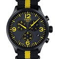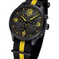 Желтый - это фирменный цвет велогоночных соревнований, нашедший себя в стильном оформлении классического хронографаХронографФункция позволяет измерять отрезки времени с особой точностью: часы, минуты, секунды. Верным признаком хронографа является наличие на циферблате 3 дополнительных окошек-счётчиков.. Задняя крышка декорирована фирменной эмблемой. Наручные часы имеют тканевый ремешок NATO, обеспечивающий невероятный комфорт при ношении. Высокоточный кварцевый механизм ETA G10.212. Чёрное износоустойчивое PVD-покрытиеPVDУльтратонкое покрытие наносится в технике вакуумного напыления, сочетает в себе нитрид титана особой прочности со слоем золота или оксида хрома. Несёт в себе декоративную или защитную функцию. корпуса. Сапфировое стекло. Водонепроницаемость до 10 бар. Окошко даты. Габариты: 45 x 45 x 11 мм.