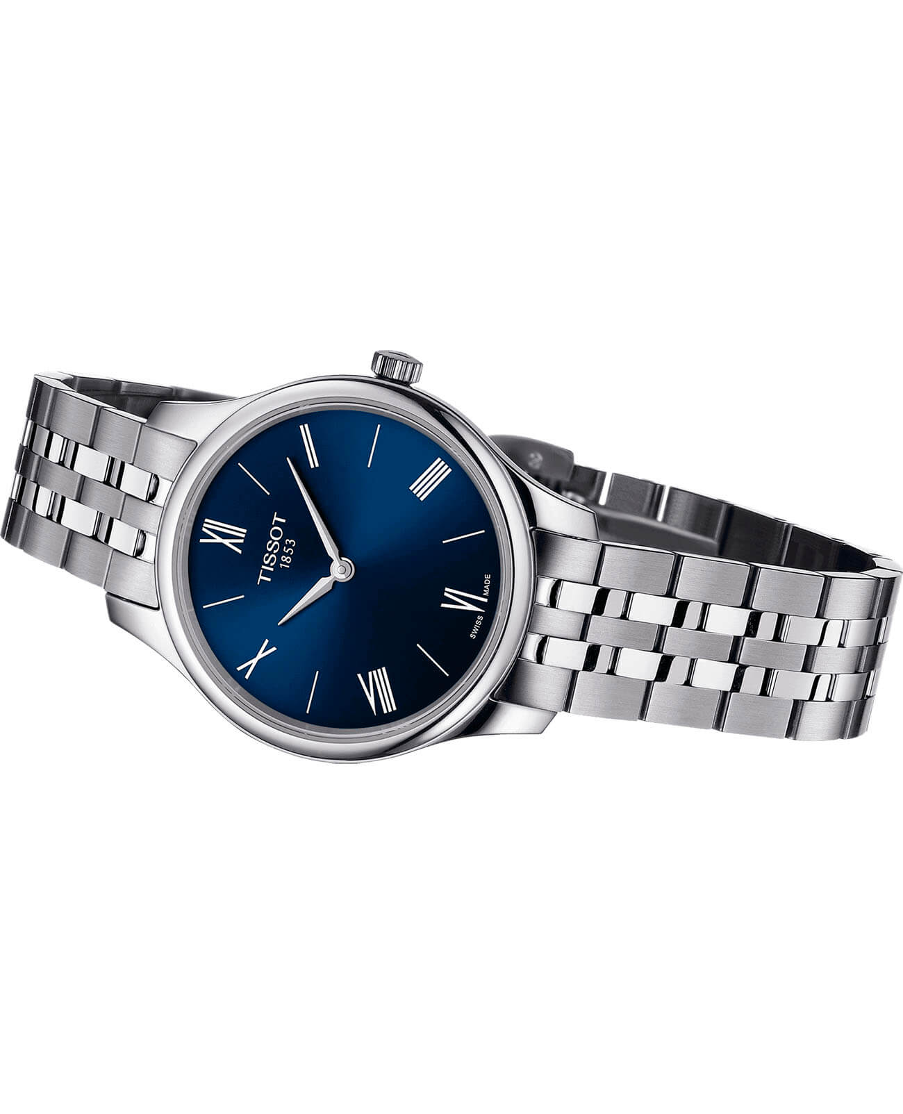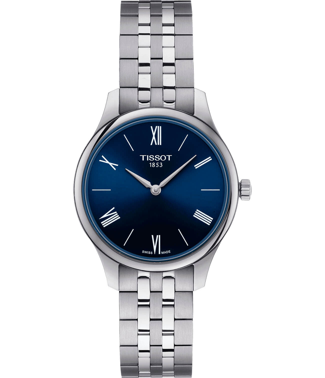 Синий циферблат, дополненный винтажными римскими цифрами, идеально смотрится в сочетании с серебристым отливом корпуса (самый тонкий из всех аксессуаров Tissot - толщина 5,5 мм) из нержавеющей стали 316L. Лаконичное оформление. Кварцевый высокоточный механизм ETA E61.031. Сапфировое стекло невозможно поцарапать. Водостойкость при давлении 3 бар. . Габариты: 31 x 31 x 5,5 мм.