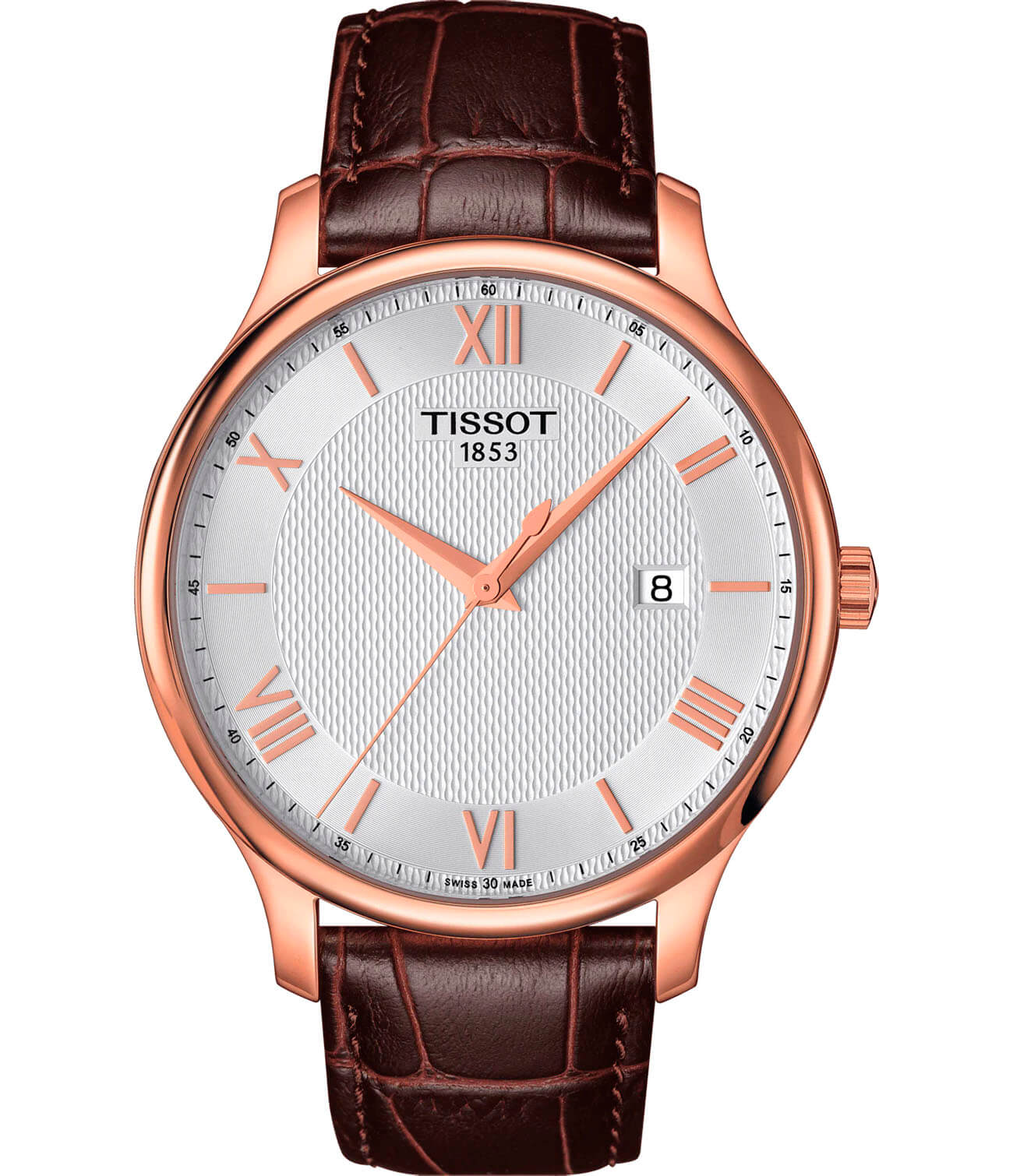 Мужские швейцарские часы с кожаным ремешком с тиснением под кожу крокодила представлены в коллекции Tissot Tradition, это элегантный аксессуар на каждый день.