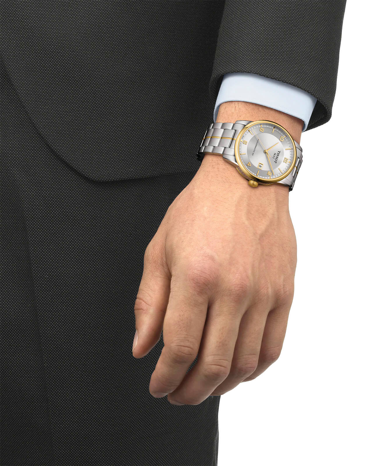 Модель представлена в классическом стиле, ни одна деталь не будет лишней. Серебристый циферблат в лаконичном исполнении дополнен контрастными стрелками, метками и арабскими цифрами. Это гарантирует оптимальную читаемость показателей времени. Наручные часы оснащены швейцарским автоматическим калибром ETA Powermatic 80Powermatic 80Эксклюзивный калибр от швейцарской компании ETA с увеличенным запасом хода до 80 часов за счёт удлинённой заводной пружины. Характеризуется улучшенной системой спуска со сниженным трением. с запасом хода 80 часов, отвечающим за высокую точность. Стекло из сапфира с покрытием "антиблик". Прозрачная задняя крышка. Отделка деталей в технике «женевские волны». Стальной корпус с PVD-покрытиемPVDУльтратонкое покрытие наносится в технике вакуумного напыления, сочетает в себе нитрид титана особой прочности со слоем золота или оксида хрома. Несёт в себе декоративную или защитную функцию. золотистого цвета. Водостойкость WR 50. Окошко даты. Габариты: 41 x 41 x 9,8 мм.