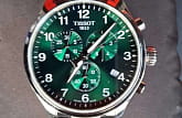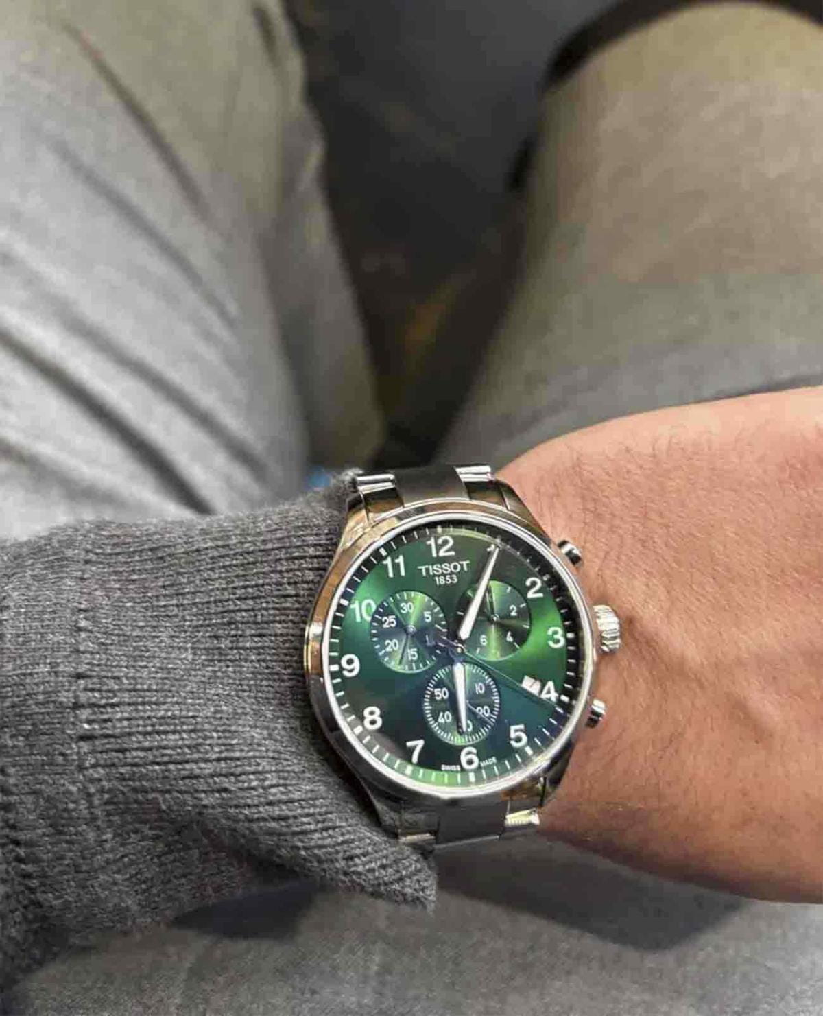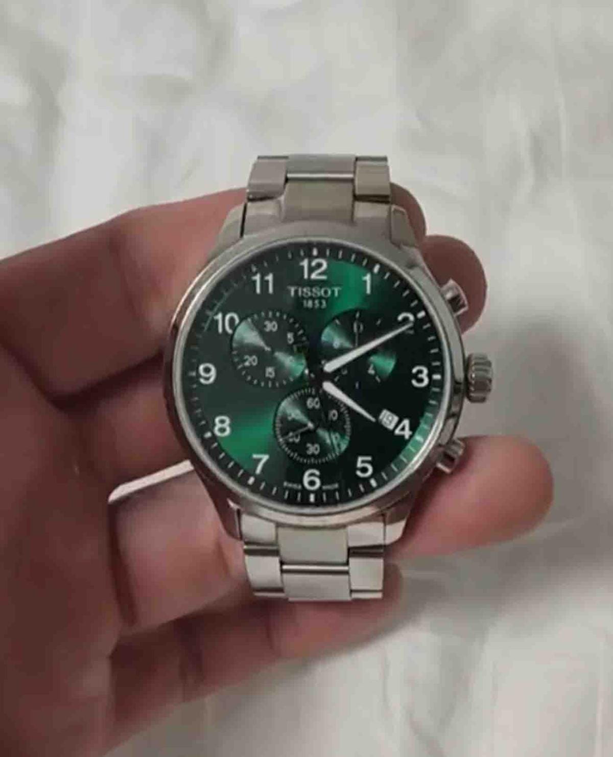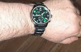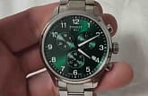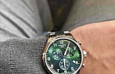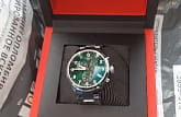 Ярко-зеленый циферблат сразу бросается в глаза, три дополнительных счётчика привносят в общий облик модели спортивный стиль. Наручные часы изготовлены из нержавеющей стали, тяжесть материала приятно ощущается на запястье и не доставляет неудобств. Кварцевый механизм ETA G10.212. Люминесцентное покрытиеЛюминесцентное покрытиеПозволяет считывать показания времени в темноте. Производители наносят на стрелки, часовые индексы, безель или поверхность циферблата светонакопительный состав, дающий холодное свечение. . Высокие показатели водозащиты - 10 бар. Габариты: 45 x 45 x 11 мм.
