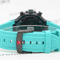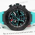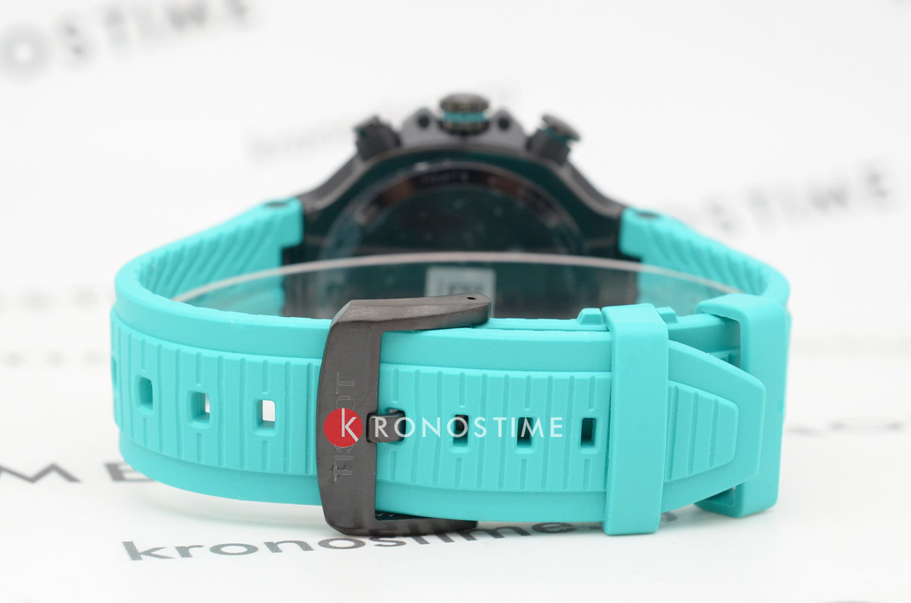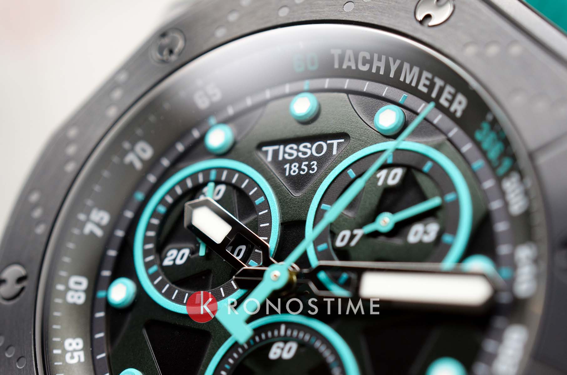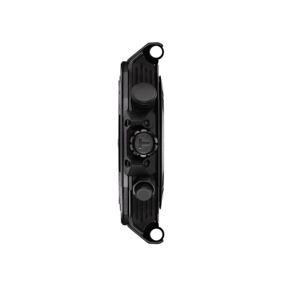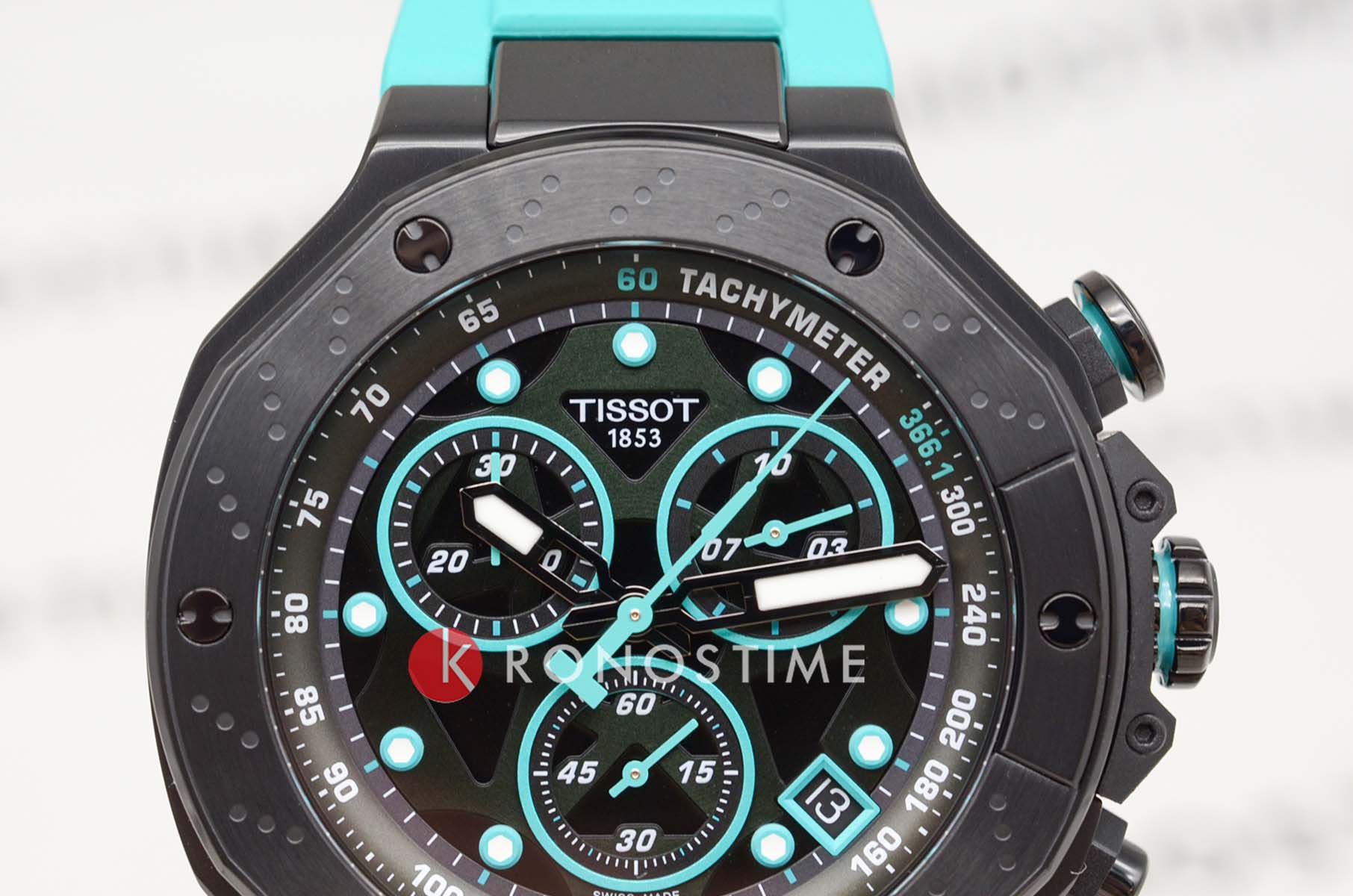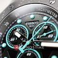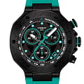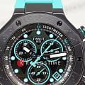 Tissot T-Race MotoGP Quartz Chronograph T141.417.37.051.01 – серия мужских часов, посвященная сотрудничеству Tissot с чемпионатом MotoGP™. Корпус диаметром 45 мм выполнен из нержавеющей стали 316L и корпус с PVD-покрытиемPVDУльтратонкое покрытие наносится в технике вакуумного напыления, сочетает в себе нитрид титана особой прочности со слоем золота или оксида хрома. Несёт в себе декоративную или защитную функцию. в чёрном цвете, придающим часам современный и спортивный вид. Глубокий циферблат защищён сапфировым стекломСапфировое стеклоПрочный и надёжный материал из кристалла сапфира синтетического происхождения, характеризующийся особой твёрдостью и устойчивостью к царапинам и повреждениям. с антибликовым покрытиемАнтибликовое покрытиеСлой оксида металла в 0,13-0,3 микрон, благодаря которому стекло часов не бликует и не отражает свет. Антибликовое покрытие уменьшает отражение света в 10 раз, обеспечивая отличную читаемость показателей циферблата., обеспечивающим устойчивость к царапинам и отличную читаемость в любых условиях. Задняя крышка корпуса украшена гравировкой, подчеркивающей уникальность модели. Часы оснащены швейцарским кварцевым механизмом, обеспечивающим высокую точность хода. Функциональность модели включает хронографХронографФункция позволяет измерять отрезки времени с особой точностью: часы, минуты, секунды. Верным признаком хронографа является наличие на циферблате 3 дополнительных окошек-счётчиков. с центральной секундной стрелкой, 30-минутным и 1/10-секундным счетчиками, а также функциями ADD и сплит-хронографаСплит-хронографИспользуется для измерения продолжительности нескольких временных отрезков, начинающихся одновременно, а заканчивающихся в разное время.. Индексы и стрелки покрыты люминесцентным покрытиемЛюминесцентное покрытиеПозволяет считывать показания времени в темноте. Производители наносят на стрелки, часовые индексы, безель или поверхность циферблата светонакопительный состав, дающий холодное свечение. Super-LumiNova®, обеспечивающим отличную видимость в темное время суток. Бирюзовый силиконовый ремешок с классической застёжкой обеспечивает комфортное ношение и надёжную фиксацию на запястье. Водозащита до 100 метров (10 бар) позволяет использовать часы во время плавания и других водных видов спорта. Эта модель идеально подходит для поклонников MotoGP™ и ценителей высококачественных швейцарских часов с уникальным дизайном и расширенной функциональностью.