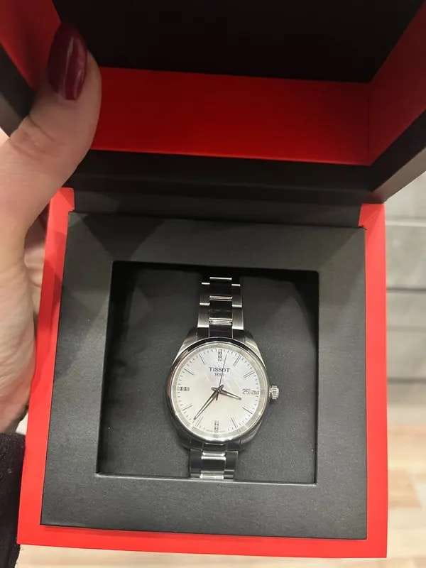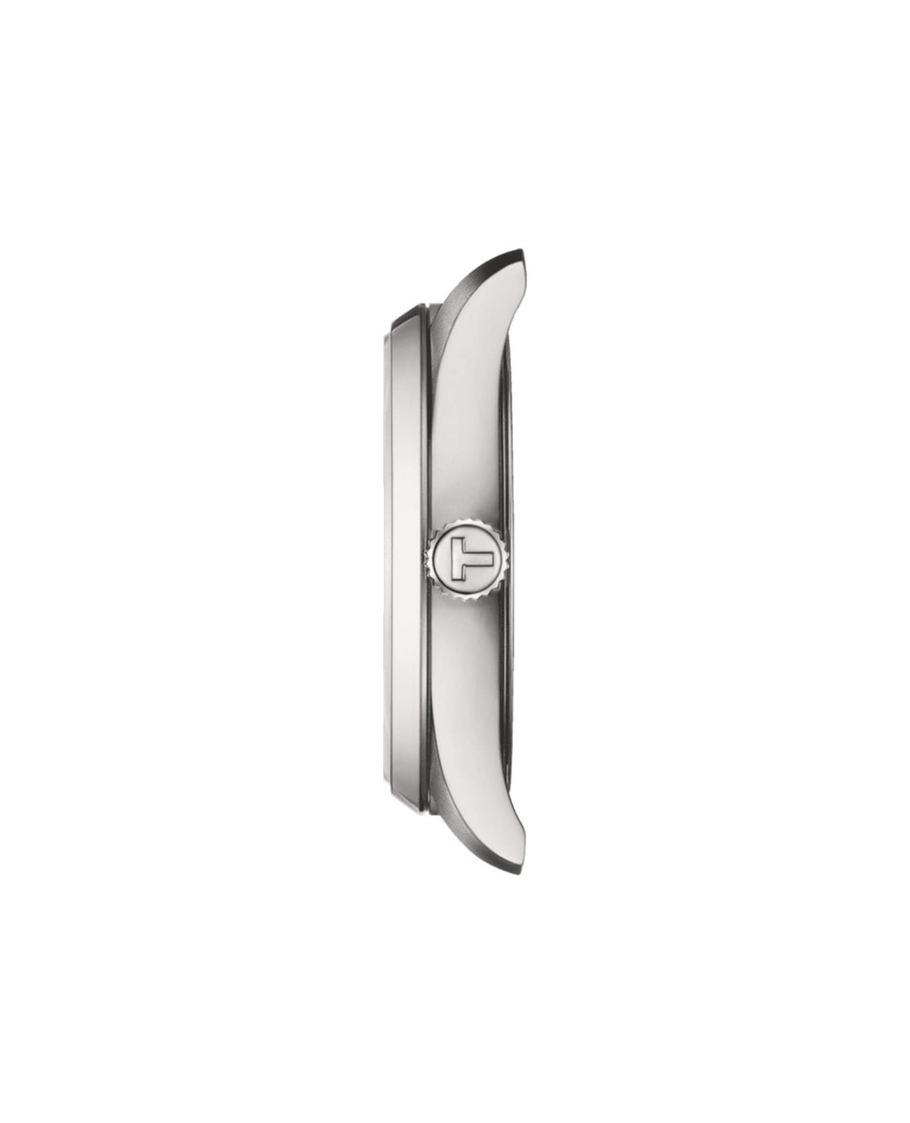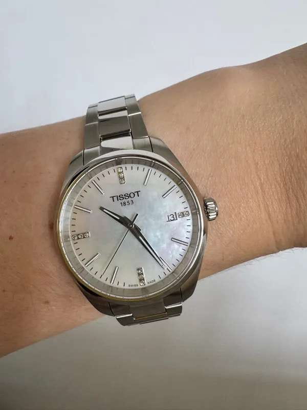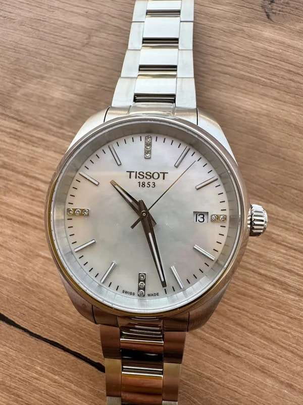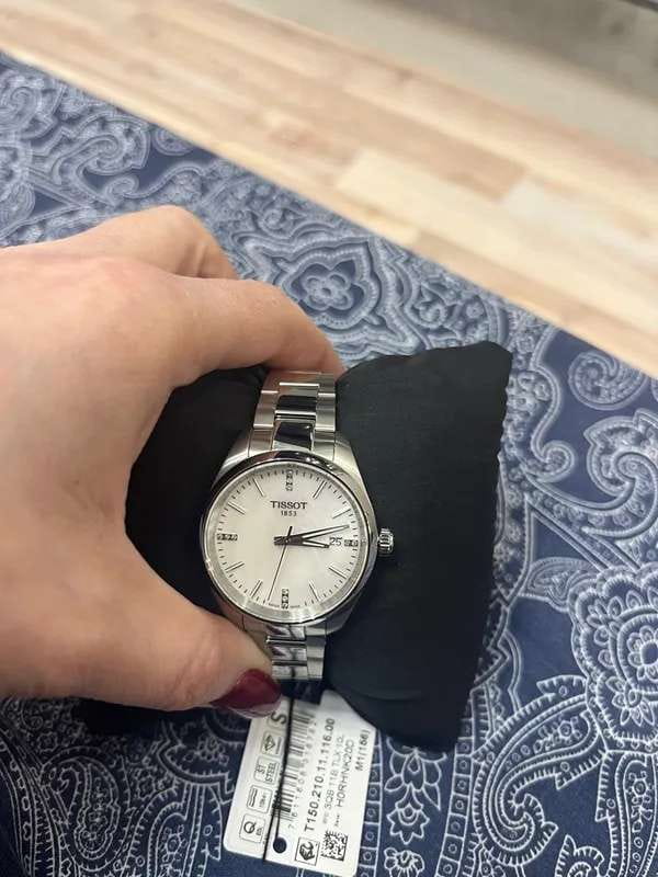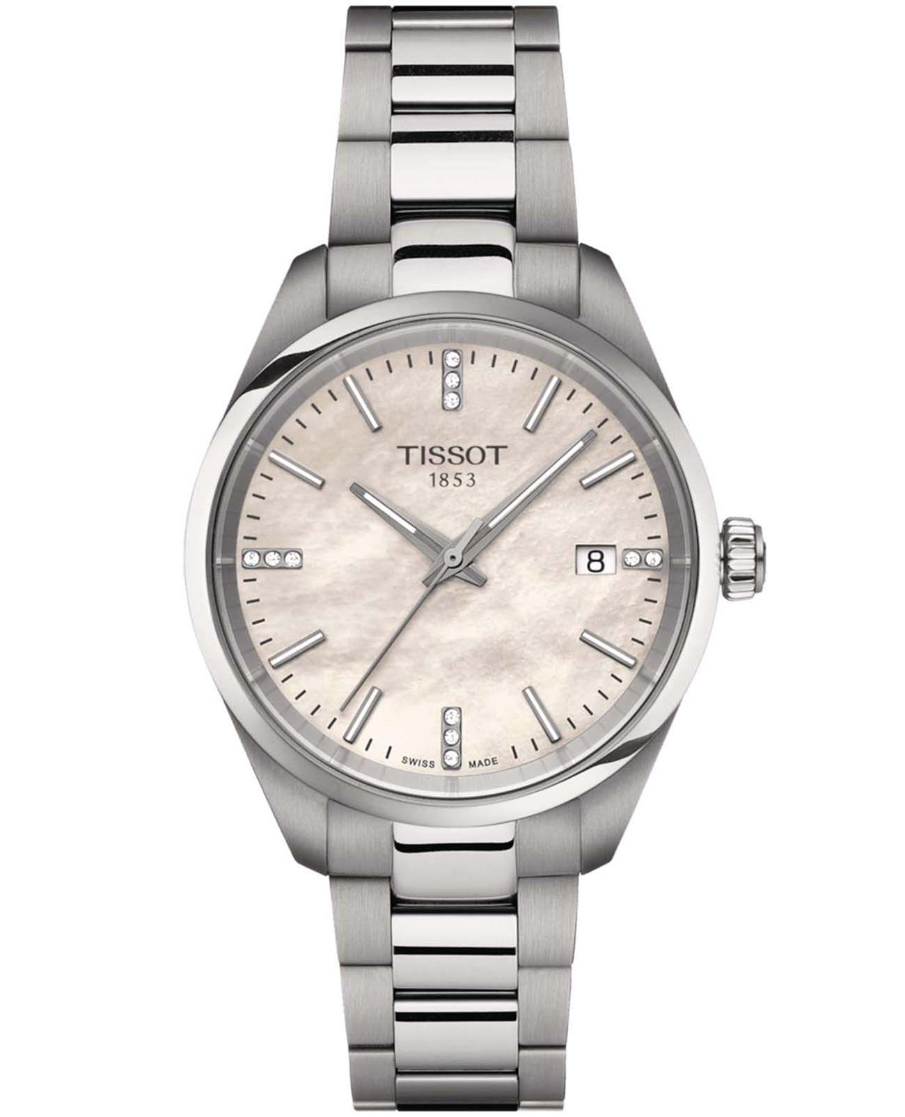 Tissot PR 100 Quartz 34mm (модель T150.210.11.116.00) – это элегантное сочетание классики и современных технологий. Корпус диаметром 34 мм выполнен из нержавеющей стали 316L, что обеспечивает надёжность и долговечность. Белый перламутровый циферблат украшен 11 бриллиантовыми метками и защищён сапфировым стекломСапфировое стеклоПрочный и надёжный материал из кристалла сапфира синтетического происхождения, характеризующийся особой твёрдостью и устойчивостью к царапинам и повреждениям., устойчивым к царапинам. Внутри установлен швейцарский кварцевый механизм с функцией EOLEOLПредставляет собой систему, уведомляющую владельца часов о необходимости замены элемента питания. За 2 недели до полного разряда батарейки секундная стрелка перестаёт ходить чётко и начинает перепрыгивать на 3-4 деления., сигнализирующей о необходимости замены батареи. Браслет из нержавеющей стали оснащён застёжкой 'бабочка'Застёжка "бабочка"Такой вид застёжки дополняется предохранителями, помогающими избежать случайного раскрытия браслета. Обладают изящным исполнением. , обеспечивающей надёжную фиксацию и удобство в повседневном ношении. Водонепроницаемость 10 бар (100 метров) позволяет использовать модель при плавании.