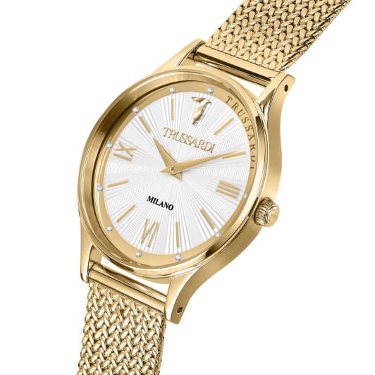 Итальянские женские часы Trussardi T-Star R2453152502 - это стильный женский аксессуар, который сочетает элегантный дизайн и практичность. Корпус выполнен из нержавеющей стали с IP-покрытиемIP-покрытиеМетод ионного напыления. Демонстрирует повышенную устойчивость к истиранию, окислению и химическим веществам. Под воздействием высокого давления и температуры около 1500°C молекулы металла надёжно соединяются с частицами корпуса часов., что обеспечивает долговечность и утончённый внешний вид. Надежное минеральное стеклоМинеральное стеклоМинеральное стекло представляет собой искусственно выращенный минерал кварца. Такое стекло отличается особой устойчивостью к повреждениям и царапинам. Уступает по некоторым качествам сапфировому стеклу. защищает циферблат от царапин и обеспечивает долговечность. Циферблат украшен кристаллами. Модель оснащена кварцевым механизмом, обеспечивающим высокую точность хода. Браслет из нержавеющей стали с IP-покрытиемIP-покрытиеМетод ионного напыления. Демонстрирует повышенную устойчивость к истиранию, окислению и химическим веществам. Под воздействием высокого давления и температуры около 1500°C молекулы металла надёжно соединяются с частицами корпуса часов. с раскладным замкомРаскладной замокДанный вариант застежки используется только на часах с металлическим браслетом. Отличительная особенность такого крепления в том, что длина браслета становится универсальной и вы можете самостоятельно отрегулировать нужный вам размер – застежка просто двигается по браслету часов. обеспечивает комфортное ношение. Водозащита 50 метров позволит защитить корпус от случайных брызг или капель дождя. Эта модель – отличный выбор для тех, кто ищет сочетание стиля, качества и функциональности. Часы станут не только полезным аксессуаром, но и выразительным элементом вашего имиджа.
