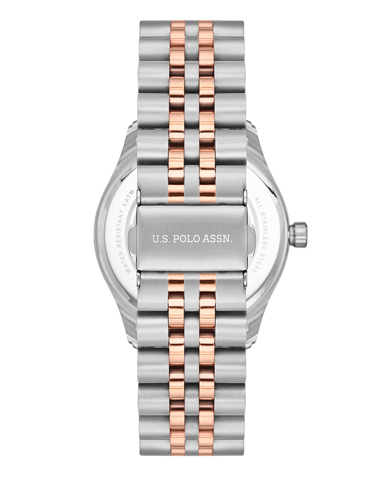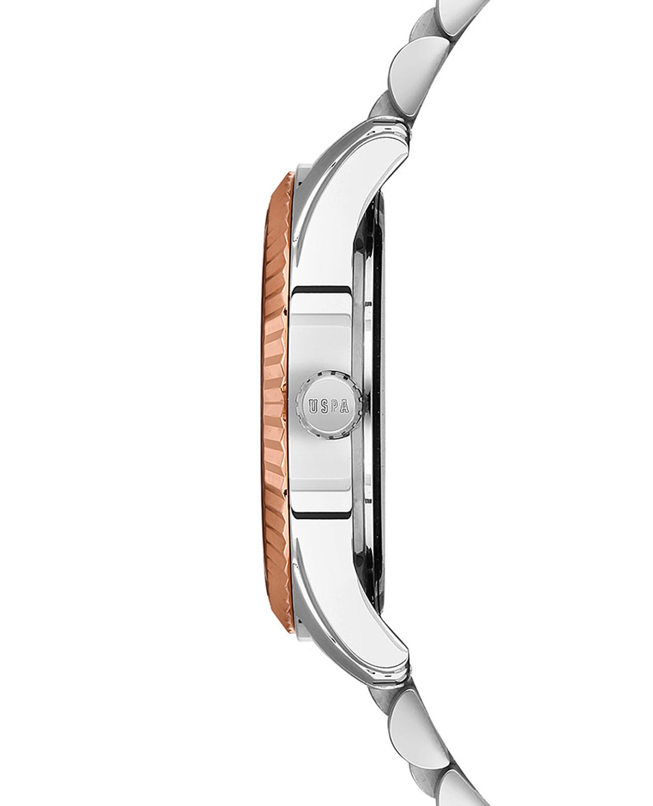 Женские часы U.S. Polo Assn Stile USPA2028-02, кварцевый механизм с высокой точностью. Минеральное стеклоМинеральное стеклоМинеральное стекло представляет собой искусственно выращенный минерал кварца. Такое стекло отличается особой устойчивостью к повреждениям и царапинам. Уступает по некоторым качествам сапфировому стеклу. устойчивое к появлению царапин, обладающее высокой прозрачностью. Корпус часов изготовлен из нержавеющей стали. БезельБезельВнешний ободок, закрепляющий стекло. В спортивных часах так называется поворотное кольцо с делениями на циферблате, выполняет роль таймера – замеряет отрезки времени на шкале. Неподвижный безель – элемент декора. Однонаправленно вращающийся безель на дайверских часах позволяет фиксировать моменты погружения и выныривания на поверхность. с IP-покрытиемIP-покрытиеМетод ионного напыления. Демонстрирует повышенную устойчивость к истиранию, окислению и химическим веществам. Под воздействием высокого давления и температуры около 1500°C молекулы металла надёжно соединяются с частицами корпуса часов.. Стрелки с люминесцентным покрытиемЛюминесцентное покрытиеПозволяет считывать показания времени в темноте. Производители наносят на стрелки, часовые индексы, безель или поверхность циферблата светонакопительный состав, дающий холодное свечение.. Класс водозащиты: 50 метров, позволит защитить корпус от случайных брызг или капель дождя. Стальной браслет с частичным  IP-покрытиемIP-покрытиеМетод ионного напыления. Демонстрирует повышенную устойчивость к истиранию, окислению и химическим веществам. Под воздействием высокого давления и температуры около 1500°C молекулы металла надёжно соединяются с частицами корпуса часов. на раскладной застёжкеРаскладная застёжкаТакой тип застёжки используется только на браслетах из металла. Она никогда не раскрывается полностью, происходит разделение на 2 и более частей. Раскладывающая застёжка снизит вероятность потери часов к минимуму..