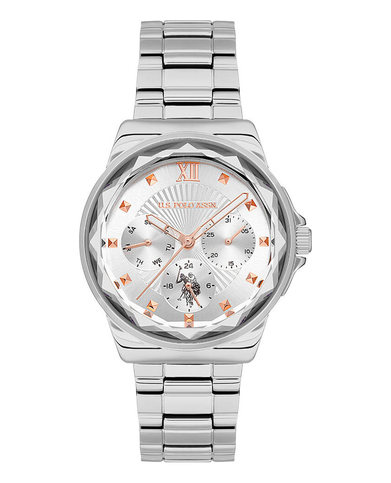 Женские часы U.S. Polo Assn Stile USPA2065-01, кварцевый механизм с высокой точностью. Минеральное стеклоМинеральное стеклоМинеральное стекло представляет собой искусственно выращенный минерал кварца. Такое стекло отличается особой устойчивостью к повреждениям и царапинам. Уступает по некоторым качествам сапфировому стеклу. устойчивое к появлению царапин, обладающее высокой прозрачностью. Корпус изготовлен из нержавеющей стали. Стрелки с люминесцентным покрытиемЛюминесцентное покрытиеПозволяет считывать показания времени в темноте. Производители наносят на стрелки, часовые индексы, безель или поверхность циферблата светонакопительный состав, дающий холодное свечение..  12/24х часовой формат времени. Класс водозащиты: 50 метров, позволит защитить корпус от случайных брызг или капель дождя. Стальной браслет на раскладной застёжкеРаскладная застёжкаТакой тип застёжки используется только на браслетах из металла. Она никогда не раскрывается полностью, происходит разделение на 2 и более частей. Раскладывающая застёжка снизит вероятность потери часов к минимуму..