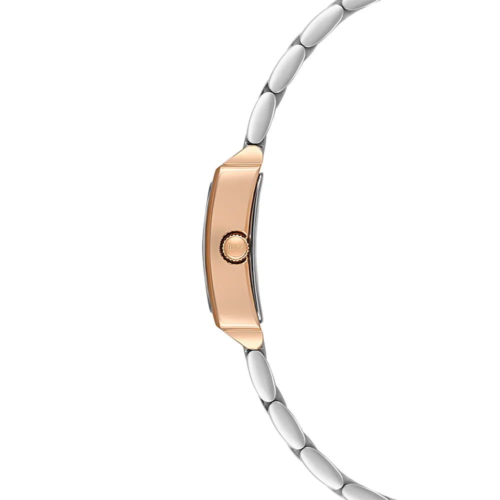 Женские наручные часы U.S. Polo Assn. Stile USPA2107-03 — это стильный и лаконичный аксессуар, выполненный в форме квадрата. Модель изготовлена из стали с IP-покрытиемIP-покрытиеМетод ионного напыления. Демонстрирует повышенную устойчивость к истиранию, окислению и химическим веществам. Под воздействием высокого давления и температуры около 1500°C молекулы металла надёжно соединяются с частицами корпуса часов., придающий благородный внешний вид и устойчивость к царапинам. Циферблат с кристаллами дополнен лаконичными центральными часовой и минутной стрелками. Защиту циферблата обеспечивает минеральное стеклоМинеральное стеклоМинеральное стекло представляет собой искусственно выращенный минерал кварца. Такое стекло отличается особой устойчивостью к повреждениям и царапинам. Уступает по некоторым качествам сапфировому стеклу., устойчивое к мелким повреждениям. Часы оснащены кварцевым механизмом, гарантирующим точность и минимальное обслуживание. Водонепроницаемость 3 АТМ позволяет использовать часы в повседневных условиях — при мытье рук или под лёгким дождём. Браслет выполнен из стали с IP-покрытиемIP-покрытиеМетод ионного напыления. Демонстрирует повышенную устойчивость к истиранию, окислению и химическим веществам. Под воздействием высокого давления и температуры около 1500°C молекулы металла надёжно соединяются с частицами корпуса часов. и оснащён раскладной застёжкойРаскладная застёжкаТакой тип застёжки используется только на браслетах из металла. Она никогда не раскрывается полностью, происходит разделение на 2 и более частей. Раскладывающая застёжка снизит вероятность потери часов к минимуму., обеспечивающей комфорт и уверенную фиксацию на запястье. Толщина корпуса составляет 7 мм, а его размер 19 мм, что делает часы компактными и удобными в носке. Эти часы станут универсальным аксессуаром для уверенных в себе женщин, которые ценят сочетание стиля, качества и эстетики — идеальный выбор для повседневного образа и торжественных случаев.