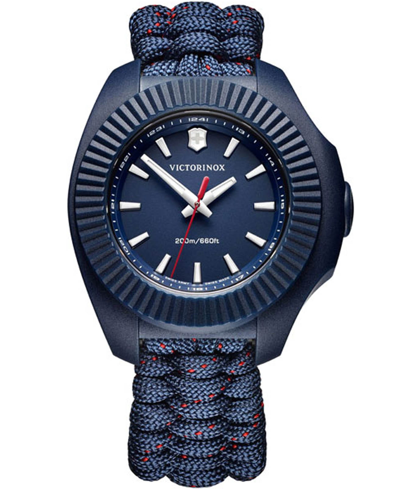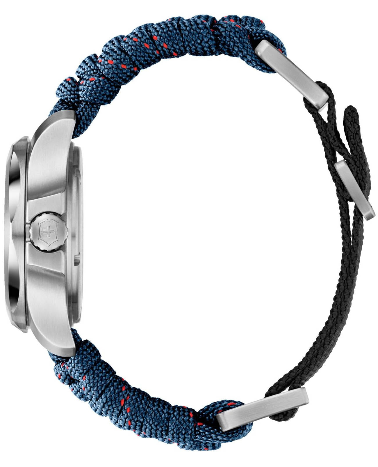 Женские швейцарские часы Victorinox I.N.O.X. V 241770. Сапфировое стеклоСапфировое стеклоПрочный и надёжный материал из кристалла сапфира синтетического происхождения, характеризующийся особой твёрдостью и устойчивостью к царапинам и повреждениям. с трёхслойным антибликовым покрытием. Корпус часов выполнен из нержавеющей стали 316L. Ремешок изготовлен из плетенной паракордовой стропы, длиной 2,5 метра и способной выдержать 250 кг. Влагозащита: 200 метров, позволит плавать, нырять и заниматься другими водными видами спорта. Стрелки и метки с люминесцентным покрытиемЛюминесцентное покрытиеПозволяет считывать показания времени в темноте. Производители наносят на стрелки, часовые индексы, безель или поверхность циферблата светонакопительный состав, дающий холодное свечение.. 12 и 24-часовой формат времени. В комплекте съемный защитный бампер.