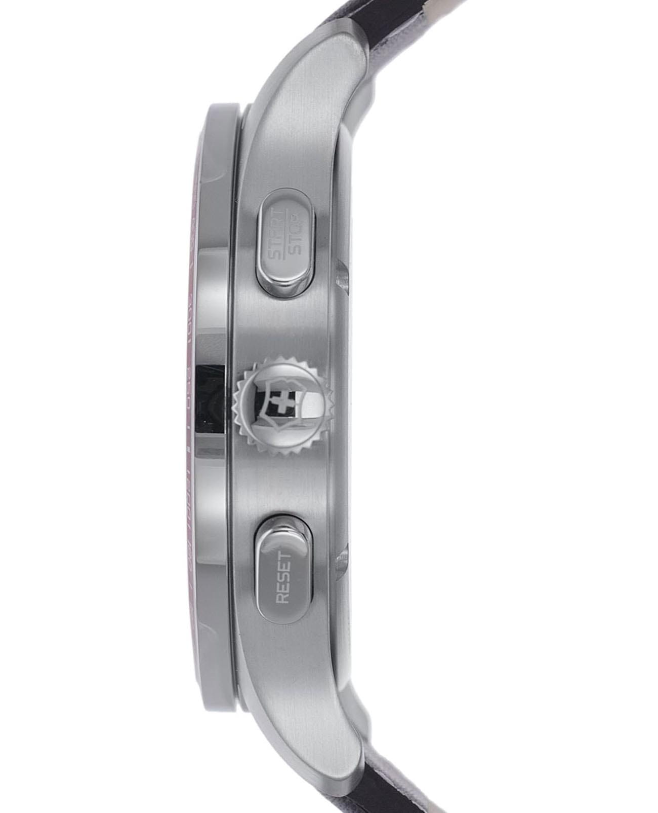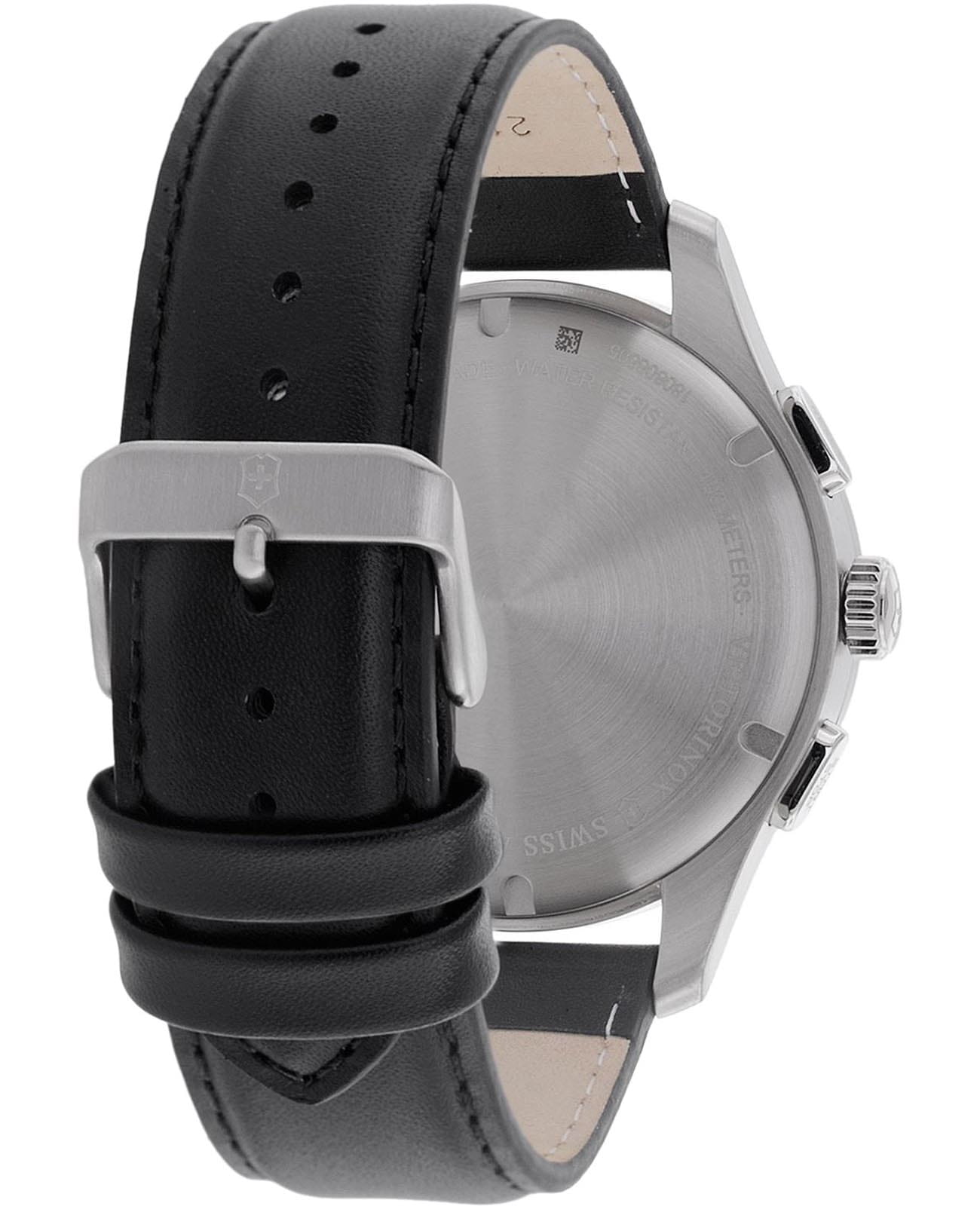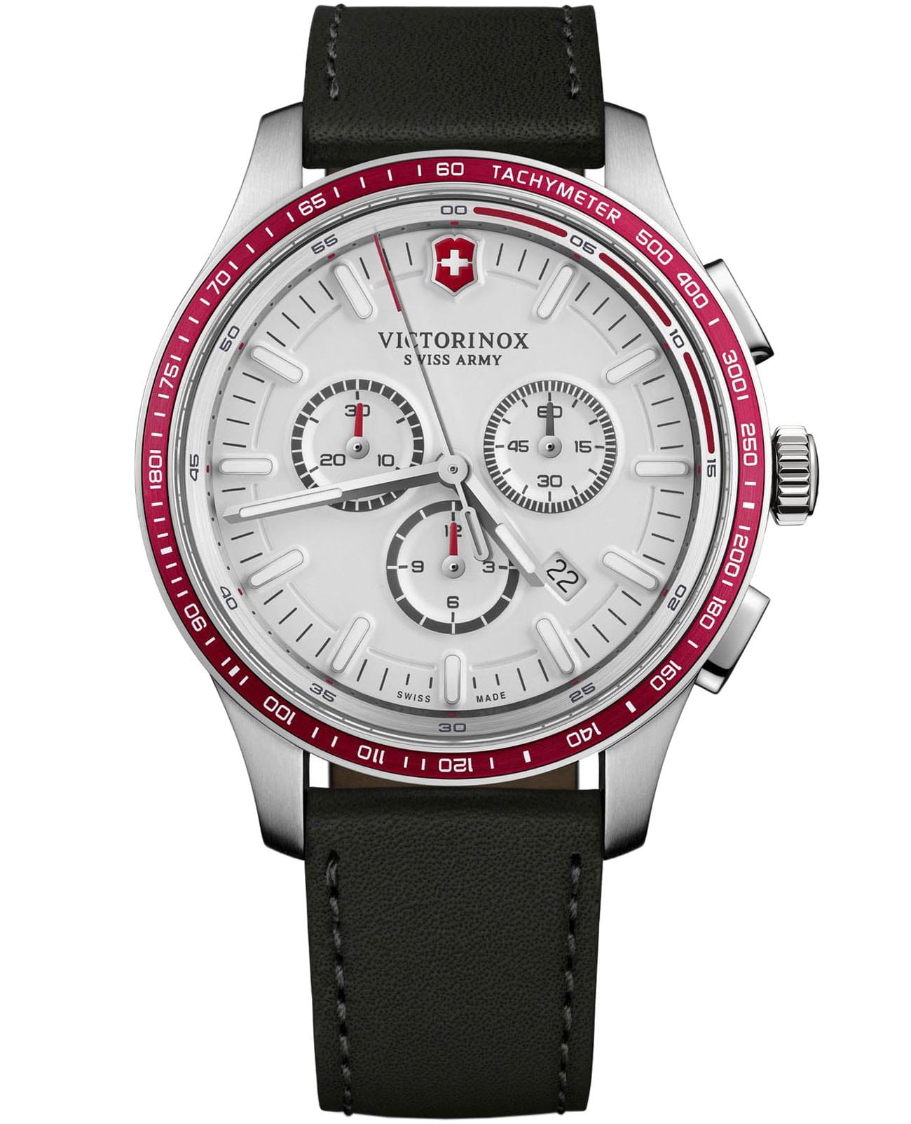 Мужские часы-хронографХронографФункция позволяет измерять отрезки времени с особой точностью: часы, минуты, секунды. Верным признаком хронографа является наличие на циферблате 3 дополнительных окошек-счётчиков. Victorinox ALLIANCE Sport Chronograph 241819 с тахиметромТахиметрРазмеченная шкала, располагается на ободке или безеле часов. Тахиметр позволяет рассчитать скорость на определённом участке пути, расстояние измеряется в километрах или милях.. Корпус часов изготовлен из нержавеющей стали. Сапфировое стеклоСапфировое стеклоПрочный и надёжный материал из кристалла сапфира синтетического происхождения, характеризующийся особой твёрдостью и устойчивостью к царапинам и повреждениям. с тройным антибликовым покрытием. Практичный кожаный ремешок на стандартной застёжке. Стрелки и метки с люминесцентным покрытиемЛюминесцентное покрытиеПозволяет считывать показания времени в темноте. Производители наносят на стрелки, часовые индексы, безель или поверхность циферблата светонакопительный состав, дающий холодное свечение.. Окошко даты находится в положении между 4 и 5 часов.