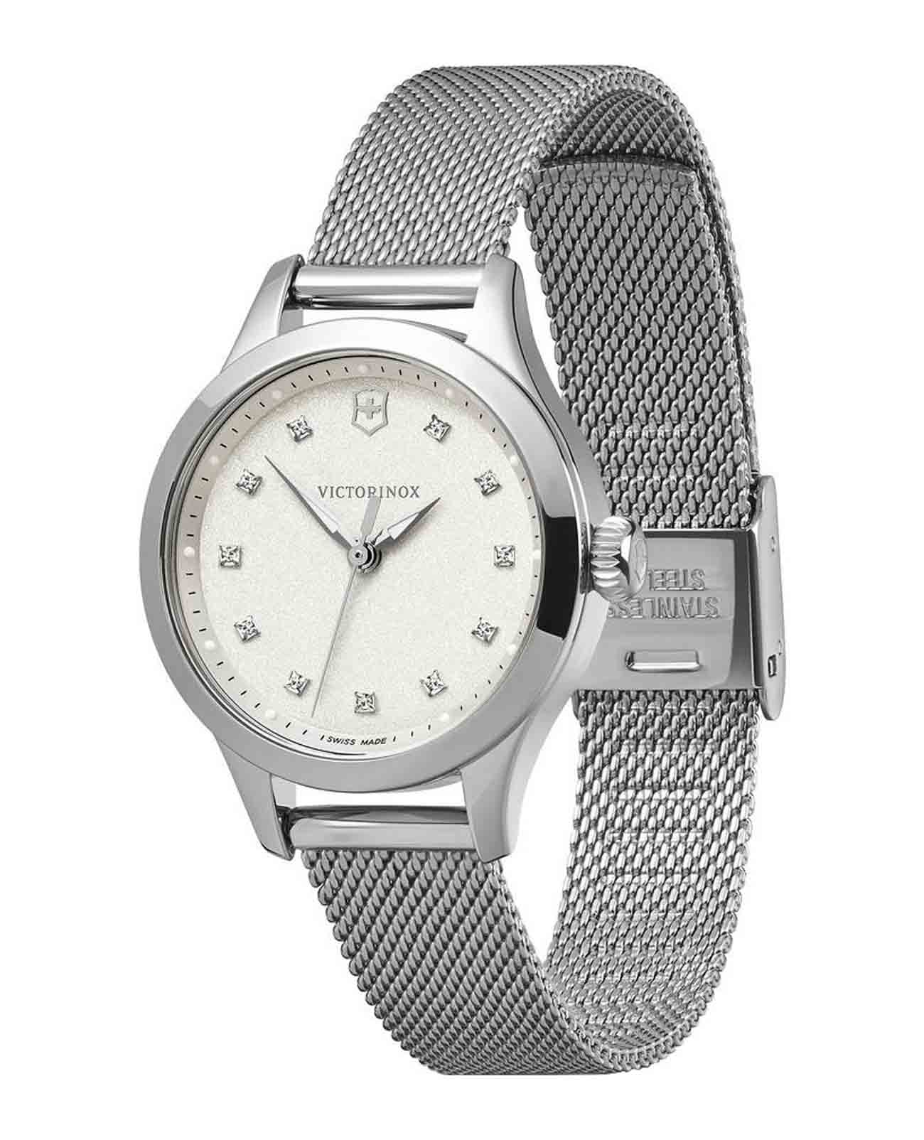 Женские часы Victorinox ALLIANCE XS 241878 с надёжным кварцевым механизмом. Корпус выполнен из нержавеющей стали. Циферблат инкрустирован кристаллами Swarovski. Стрелки и метки с люминесцентным покрытиемЛюминесцентное покрытиеПозволяет считывать показания времени в темноте. Производители наносят на стрелки, часовые индексы, безель или поверхность циферблата светонакопительный состав, дающий холодное свечение.. Класс водозащиты: 100 метров, позволит плавать, нырять и заниматься другими водными видами спорта. Стальной браслет миланского плетения на раскладном замкеРаскладной замокДанный вариант застежки используется только на часах с металлическим браслетом. Отличительная особенность такого крепления в том, что длина браслета становится универсальной и вы можете самостоятельно отрегулировать нужный вам размер – застежка просто двигается по браслету часов..
