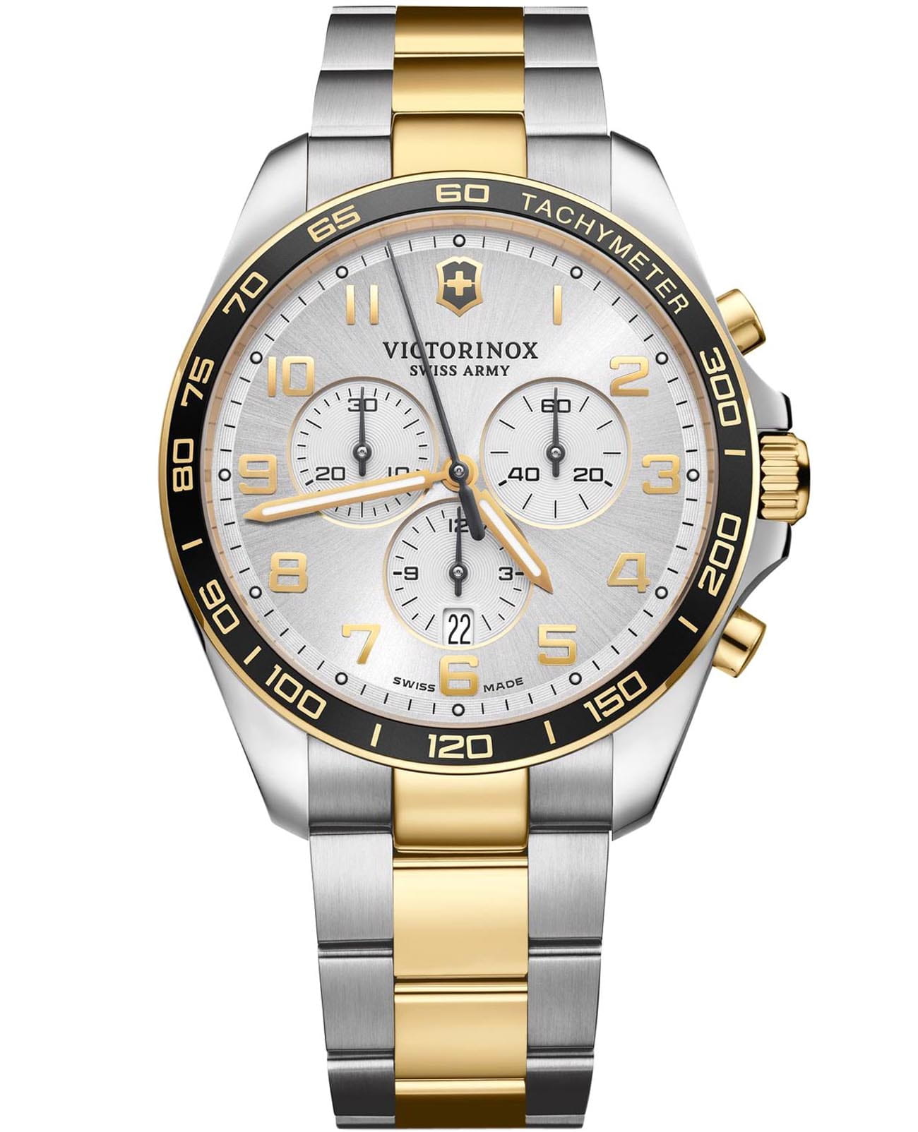 Мужские швейцарские часы-хронографХронографФункция позволяет измерять отрезки времени с особой точностью: часы, минуты, секунды. Верным признаком хронографа является наличие на циферблате 3 дополнительных окошек-счётчиков. Victorinox Fieldforce Chronograph 241903 с надёжным кварцевым механизмом. Сапфировое стеклоСапфировое стеклоПрочный и надёжный материал из кристалла сапфира синтетического происхождения, характеризующийся особой твёрдостью и устойчивостью к царапинам и повреждениям. с трёхслойным антибликовым покрытием. Корпус часов выполнен из нержавеющей стали 316L. Стальной браслет с частичным PVD-покрытиемPVDУльтратонкое покрытие наносится в технике вакуумного напыления, сочетает в себе нитрид титана особой прочности со слоем золота или оксида хрома. Несёт в себе декоративную или защитную функцию. на раскладной застёжкеРаскладная застёжкаТакой тип застёжки используется только на браслетах из металла. Она никогда не раскрывается полностью, происходит разделение на 2 и более частей. Раскладывающая застёжка снизит вероятность потери часов к минимуму.. Влагозащита: 100 метров, позволит плавать, нырять и заниматься другими водными видами спорта. Окошко даты находится в положении 6 часов, стрелки и метки с люминесцентным покрытиемЛюминесцентное покрытиеПозволяет считывать показания времени в темноте. Производители наносят на стрелки, часовые индексы, безель или поверхность циферблата светонакопительный состав, дающий холодное свечение., тахиметрТахиметрРазмеченная шкала, располагается на ободке или безеле часов. Тахиметр позволяет рассчитать скорость на определённом участке пути, расстояние измеряется в километрах или милях..