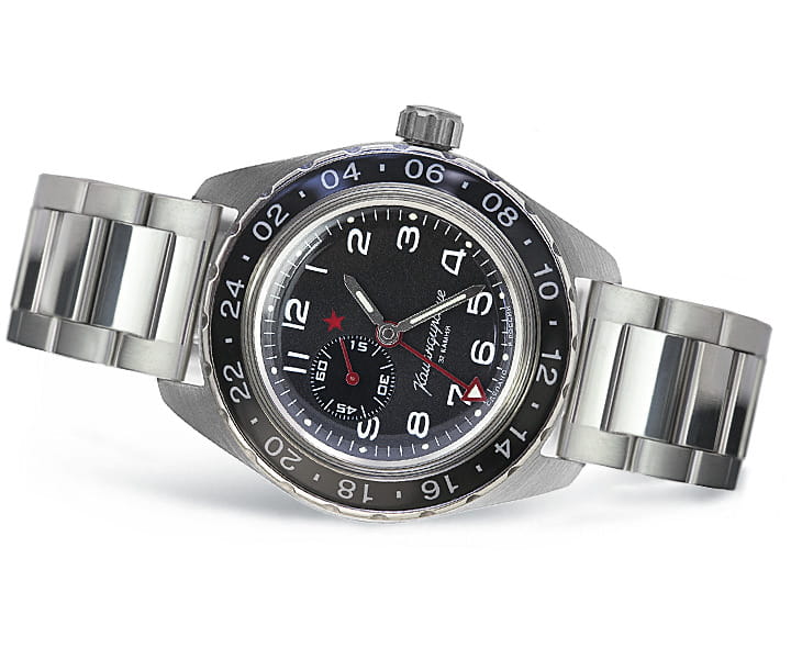 Мужские российские механические наручные часы Восток Командирские 02019А, механический механизм (автоматический калибр) с высокой точностью. Класс водозащиты: 200 метров, позволит плавать, нырять и заниматься другими водными видами спорта. Стрелки с люминесцентным покрытиемЛюминесцентное покрытиеПозволяет считывать показания времени в темноте. Производители наносят на стрелки, часовые индексы, безель или поверхность циферблата светонакопительный состав, дающий холодное свечение.. Вращающийся безельБезельВнешний ободок, закрепляющий стекло. В спортивных часах так называется поворотное кольцо с делениями на циферблате, выполняет роль таймера – замеряет отрезки времени на шкале. Неподвижный безель – элемент декора. Однонаправленно вращающийся безель на дайверских часах позволяет фиксировать моменты погружения и выныривания на поверхность. из нержавеющей стали с PVDPVDУльтратонкое покрытие наносится в технике вакуумного напыления, сочетает в себе нитрид титана особой прочности со слоем золота или оксида хрома. Несёт в себе декоративную или защитную функцию. покрытием. Дополнительная 24-часовая стрелка. Механизм калибра 24 мм с боковой секундной стрелкой. Автоподзавод с предохранительным устройством от перезаводки пружины. Частота: 19800 полуколебаний/час. Браслет с раскладной застёжкойРаскладная застёжкаТакой тип застёжки используется только на браслетах из металла. Она никогда не раскрывается полностью, происходит разделение на 2 и более частей. Раскладывающая застёжка снизит вероятность потери часов к минимуму..