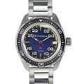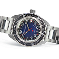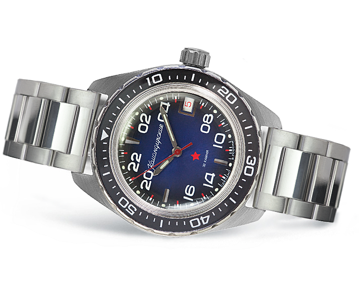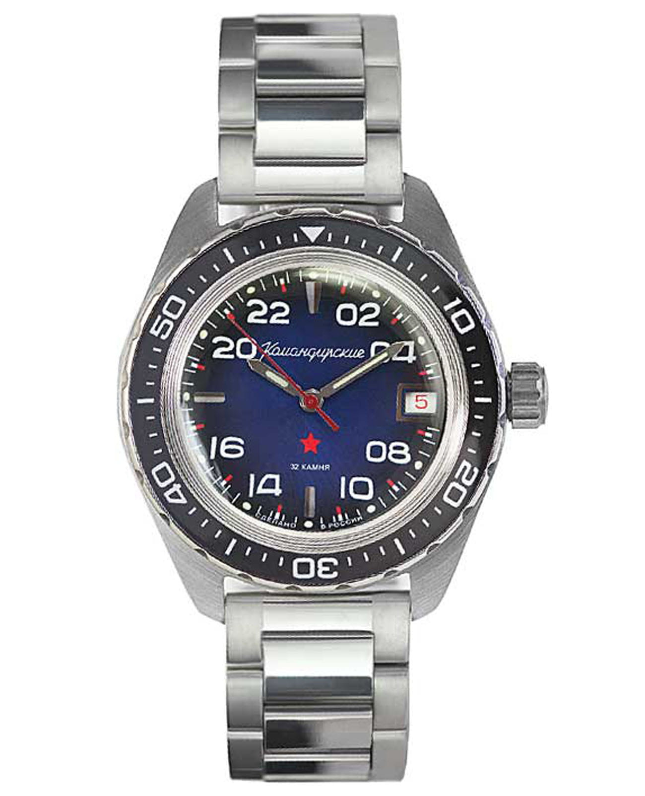 Мужские российские механические наручные часы Восток Командирские 02036А, механический механизм (автоматический калибр) с высокой точностью. Класс водозащиты: 200 метров, позволит плавать, нырять и заниматься другими водными видами спорта. Стрелки с люминесцентным покрытиемЛюминесцентное покрытиеПозволяет считывать показания времени в темноте. Производители наносят на стрелки, часовые индексы, безель или поверхность циферблата светонакопительный состав, дающий холодное свечение.. Вращающийся безельБезельВнешний ободок, закрепляющий стекло. В спортивных часах так называется поворотное кольцо с делениями на циферблате, выполняет роль таймера – замеряет отрезки времени на шкале. Неподвижный безель – элемент декора. Однонаправленно вращающийся безель на дайверских часах позволяет фиксировать моменты погружения и выныривания на поверхность. из нержавеющей стали с PVDPVDУльтратонкое покрытие наносится в технике вакуумного напыления, сочетает в себе нитрид титана особой прочности со слоем золота или оксида хрома. Несёт в себе декоративную или защитную функцию. покрытием. Окошко даты находится в положении 3 часа. Автоподзавод с предохранительным устройством от перезаводки пружины. Частота: 19800 полуколебаний/час. Браслет с раскладной застёжкойРаскладная застёжкаТакой тип застёжки используется только на браслетах из металла. Она никогда не раскрывается полностью, происходит разделение на 2 и более частей. Раскладывающая застёжка снизит вероятность потери часов к минимуму..