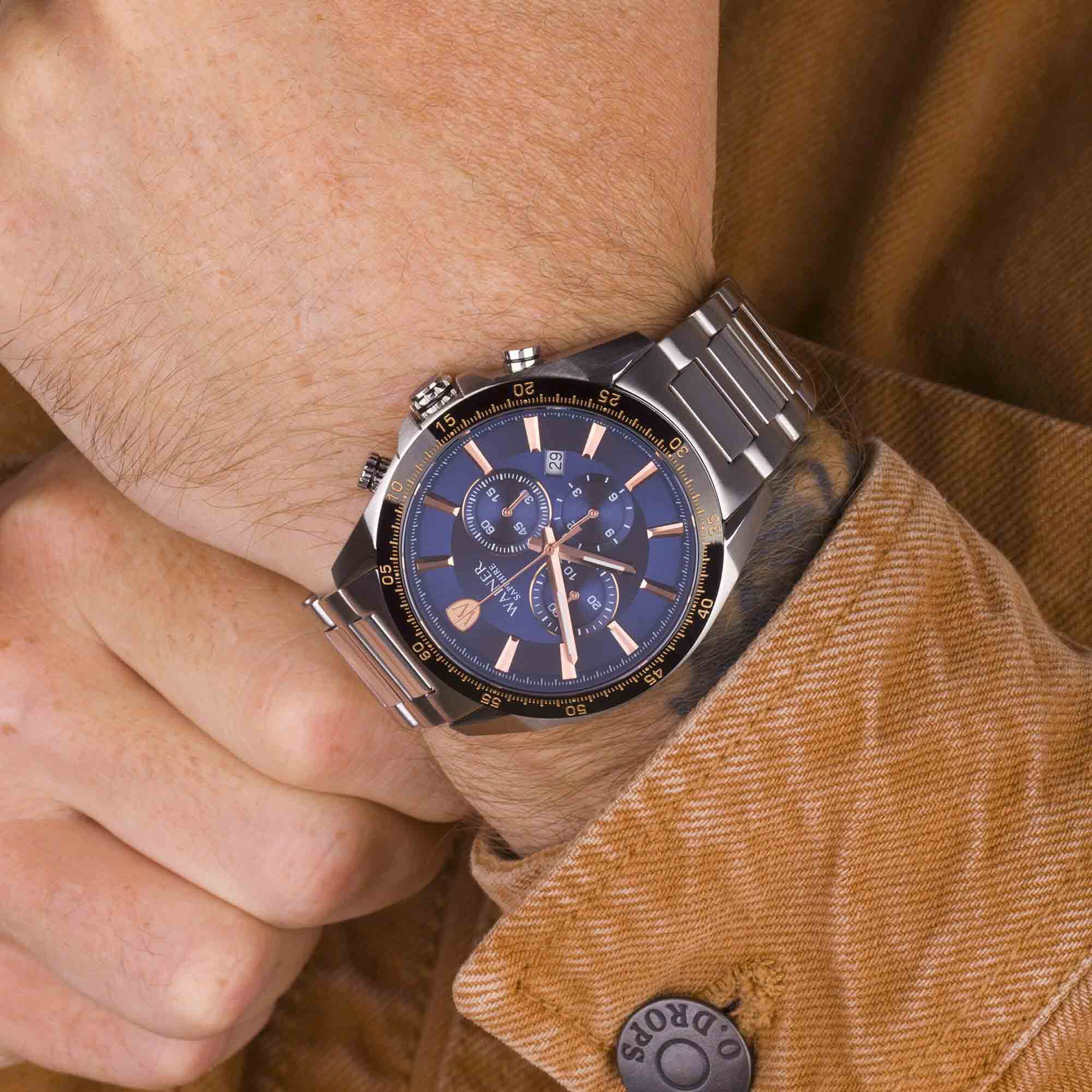 Мужские кварцевые часы Wainer — это стильный аксессуар, сочетающий в себе швейцарское качество и функциональность. Модель выполнена из нержавеющей стали 316L с диаметром корпуса 45 мм и толщиной 12 мм, что делает её прочной и устойчивой к царапинам. Циферблат синего цвета дополнен люминесцентными стрелками, обеспечивающими отличную читаемость даже в условиях слабого освещения. Защиту механизма обеспечивает сапфировое стеклоСапфировое стеклоПрочный и надёжный материал из кристалла сапфира синтетического происхождения, характеризующийся особой твёрдостью и устойчивостью к царапинам и повреждениям., устойчивое к повреждениям. Браслет из стали 316L шириной 22-19 мм оснащён Раскладная застёжкаРаскладная застёжкаТакой тип застёжки используется только на браслетах из металла. Она никогда не раскрывается полностью, происходит разделение на 2 и более частей. Раскладывающая застёжка снизит вероятность потери часов к минимуму., обеспечивающей комфорт и надёжную фиксацию на запястье. Часы водонепроницаемы до 100 метров (, что позволяет использовать их при плавании и других водных активностях без глубокого погружения. Функции включают отображение даты, хронограф и секундомер, что делает модель удобной для повседневного использования. Эти часы станут универсальным аксессуаром для тех, кто ценит сочетание стиля, функциональности и швейцарского мастерства — идеальный выбор для повседневной носки и активного образа жизни.