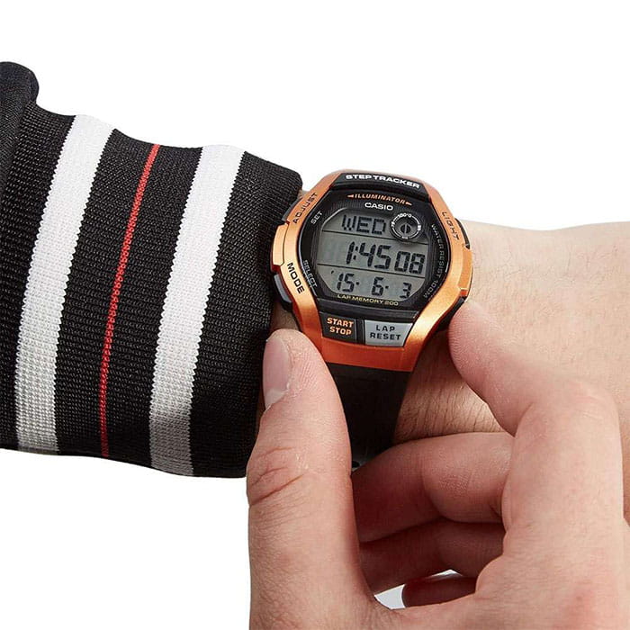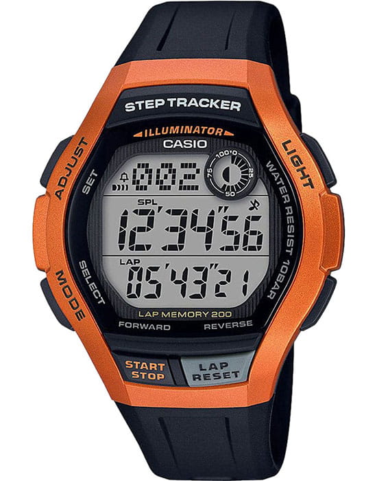 Standard Digital Циферблат подсвечивается светодиодом Мировое время 12-ти и 24-х часовой формат времени Секундомер с точностью показаний 1/100с и временем измерения 24ч Сплит-хронограф Таймер обратного отсчета от 1сек до 1ч Память на 200 кругов Шагомер Возможность включения или выключения звука кнопок
