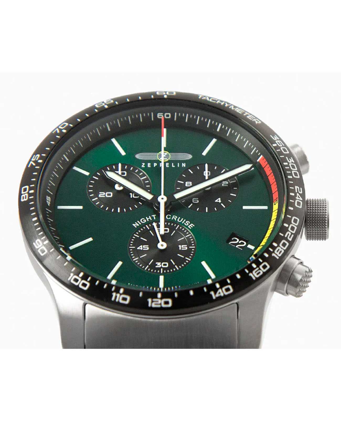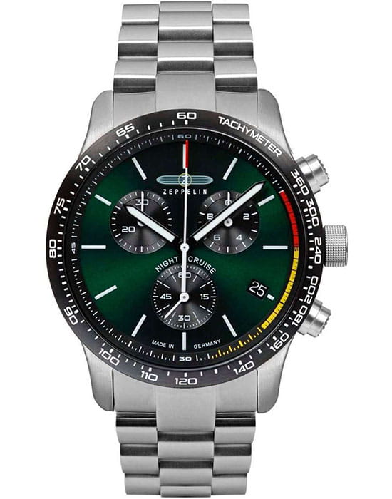 Мужские наручные часы-хронографХронографФункция позволяет измерять отрезки времени с особой точностью: часы, минуты, секунды. Верным признаком хронографа является наличие на циферблате 3 дополнительных окошек-счётчиков. Zeppelin Night Cruise 7288M4 сочетают в себе спортивный дизайн и надежность современных технологий. Модель обладает круглым корпусом диаметром 42 мм, изготовленным из нержавеющей стали с полированным/матовым покрытием, что обеспечивает высокую устойчивость к внешним воздействиям. Толщина корпуса составляет 14 мм. Браслет выполнен из нержавеющей стали с классической застежкой, гарантирующей комфортное ношение и безопасность. Зеленый циферблат оснащен шкалой с тахиметромТахиметрРазмеченная шкала, располагается на ободке или безеле часов. Тахиметр позволяет рассчитать скорость на определённом участке пути, расстояние измеряется в километрах или милях. по краю и дополнен малыми циферблатами для функций хронографа, а также окном даты на позиции «4 часов». Для защиты используется минеральное стеклоМинеральное стеклоМинеральное стекло представляет собой искусственно выращенный минерал кварца. Такое стекло отличается особой устойчивостью к повреждениям и царапинам. Уступает по некоторым качествам сапфировому стеклу. с антибликовым покрытиемАнтибликовое покрытиеСлой оксида металла в 0,13-0,3 микрон, благодаря которому стекло часов не бликует и не отражает свет. Антибликовое покрытие уменьшает отражение света в 10 раз, обеспечивая отличную читаемость показателей циферблата., обеспечивающее прочную защиту от царапин и оптимальную видимость циферблата даже при ярком свете. Часы работают на кварцевом механизме ETA G10.212, который гарантирует точное время без необходимости подзаводки. Водонепроницаемость часов достигает 10 атмосфер (100 метров), что позволяет использовать их во время плавания и других водных видов спорта, однако не рекомендуется для глубоководного дайвинга.