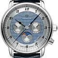 Немецкие мужские кварцевые часы Zeppelin ZEP-85363 из коллекции Friedrichshafen Moon Phase оснащены механизмом калибра Ronda 706.1. Круглый корпус из полированной нержавеющей стали диаметром 40 мм и толщиной 11 мм защищен слегка выпуклым минеральным стекломМинеральное стеклоМинеральное стекло представляет собой искусственно выращенный минерал кварца. Такое стекло отличается особой устойчивостью к повреждениям и царапинам. Уступает по некоторым качествам сапфировому стеклу. повышенной прочности K1. Циферблат синего цвета выполнен по технологии гильоше с узором Clous de Paris и украшен метками в виде арабских цифр. Модель дополнена функциями отображения даты, дня недели и фаз Луны, каждая из которых расположена на отдельных малых циферблатах.Часы имеют водонепроницаемость 50 метров, позволит защитить корпус от случайных брызг или капель дождя. Задняя крышка выполнена из штампованной нержавеющей стали, а рифленая заводная головка также изготовлена из нержавеющей стали. Модель комплектуется синим кожаным ремешком с имитацией крокодиловой кожи и классической застежкой из нержавеющей стали. Вес модели составляет 62 грамма.Прочный корпус, уникальный дизайн и надежный механизм делают эти часы универсальным аксессуаром для ценителей функциональности и элегантности.